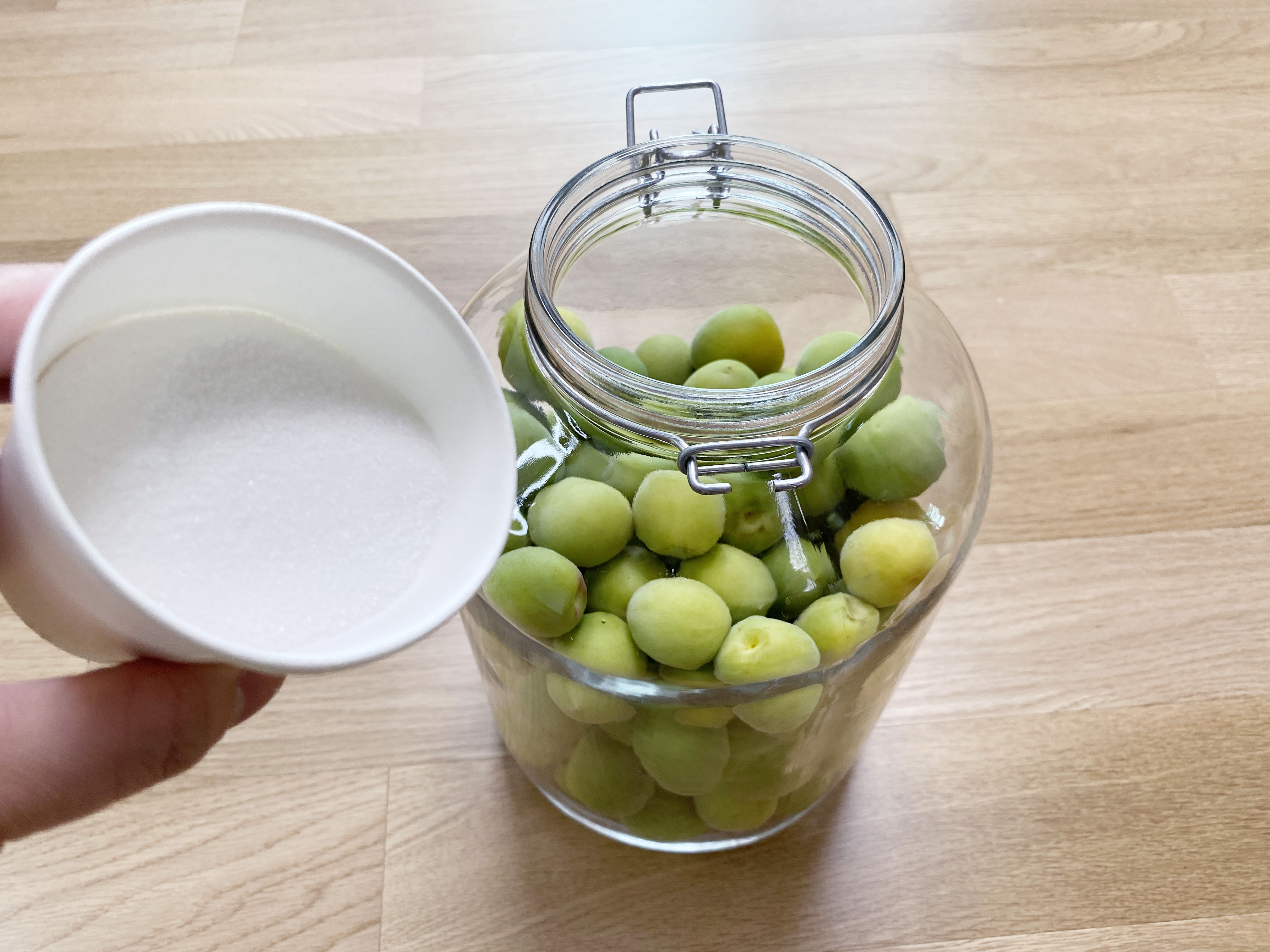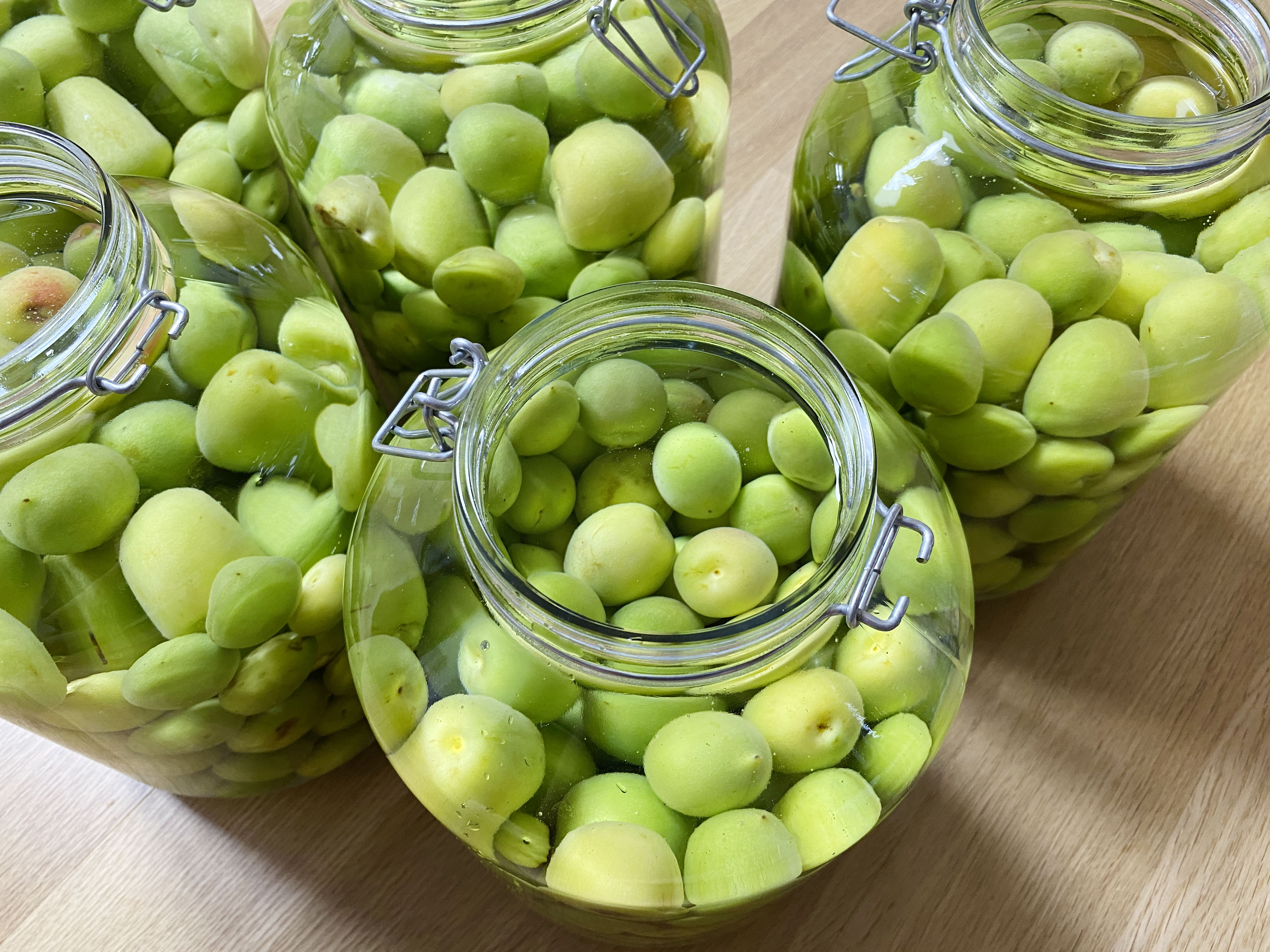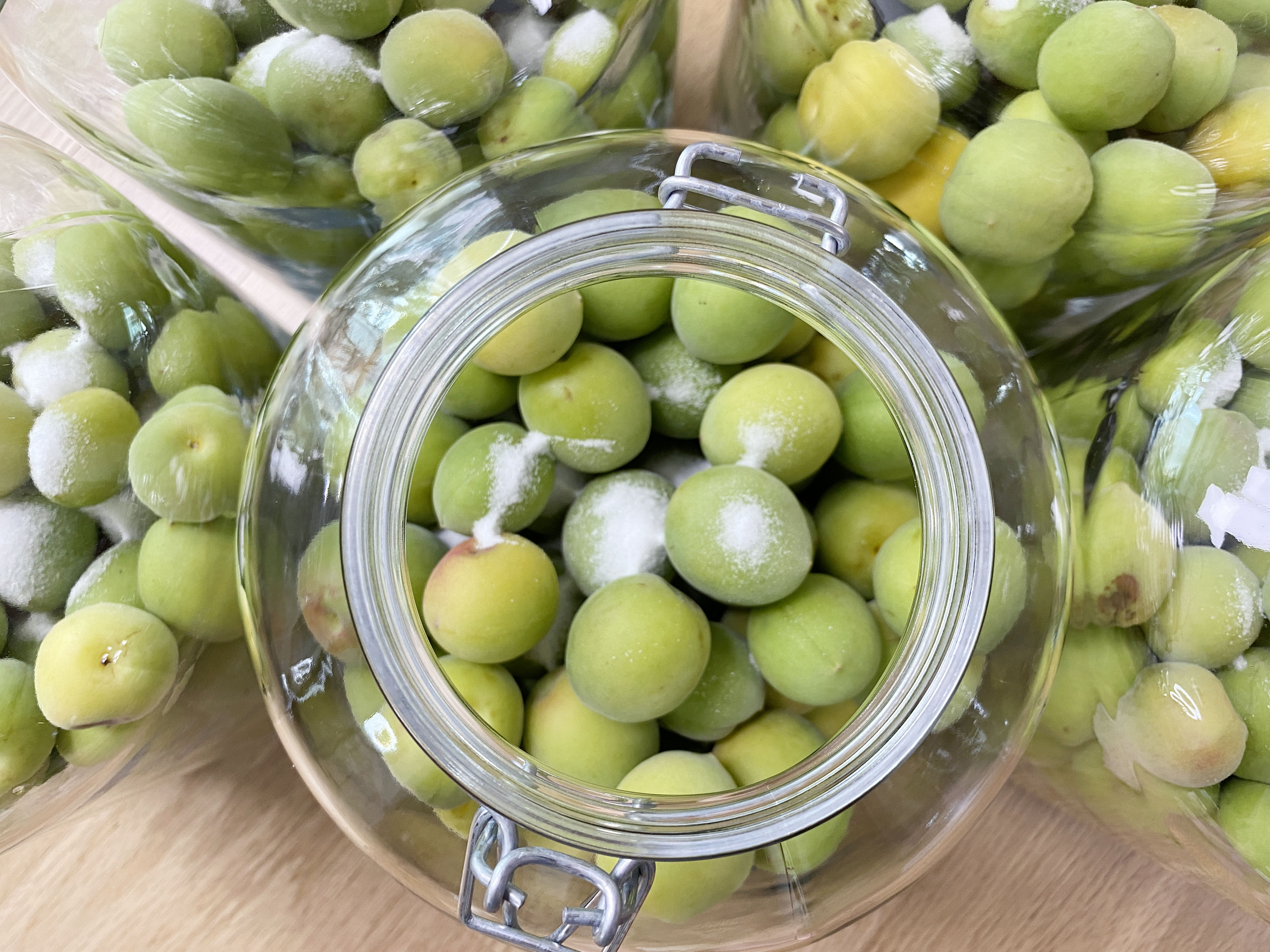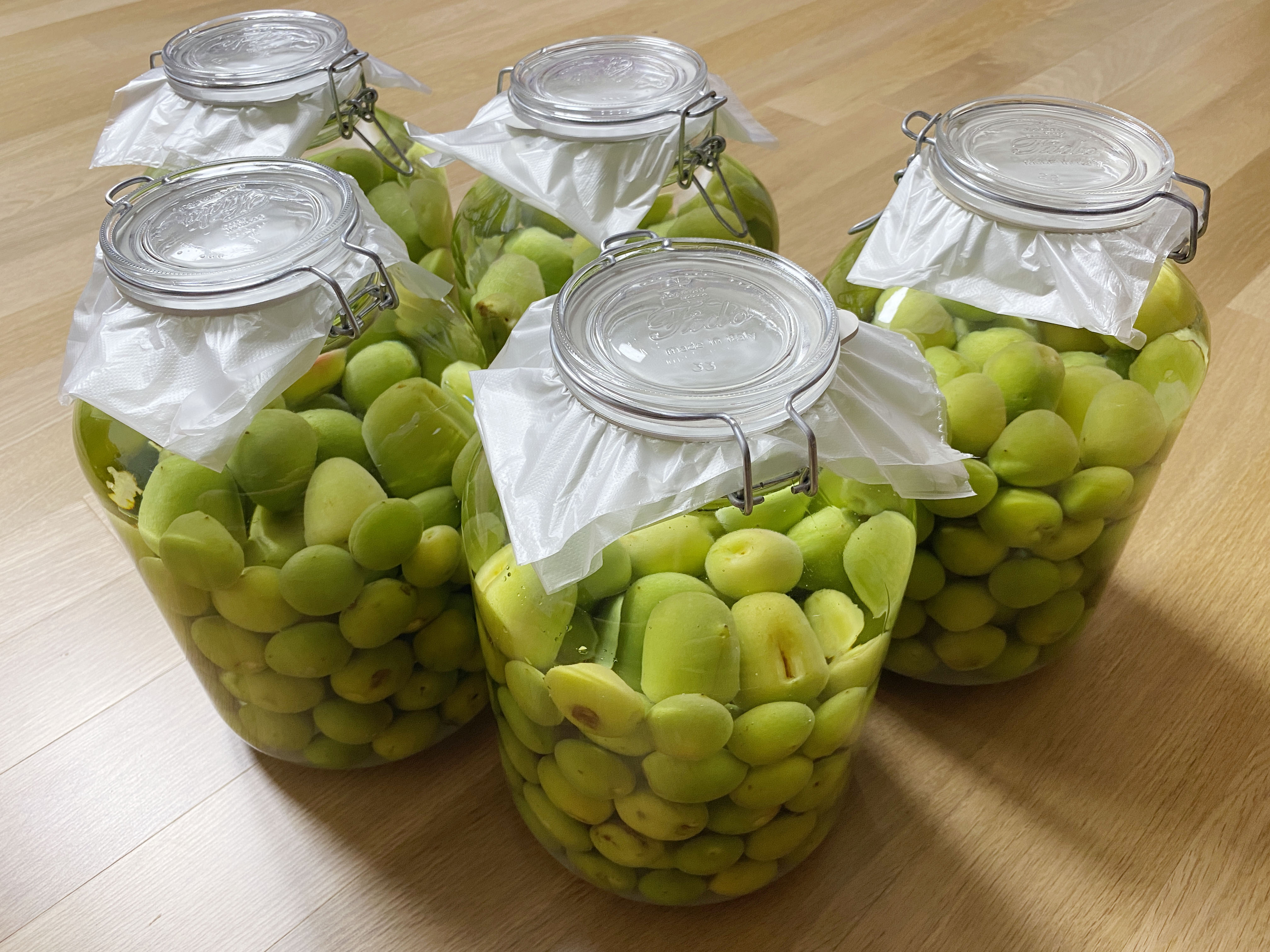 손질한 매실을 병 5개 나눠 담고