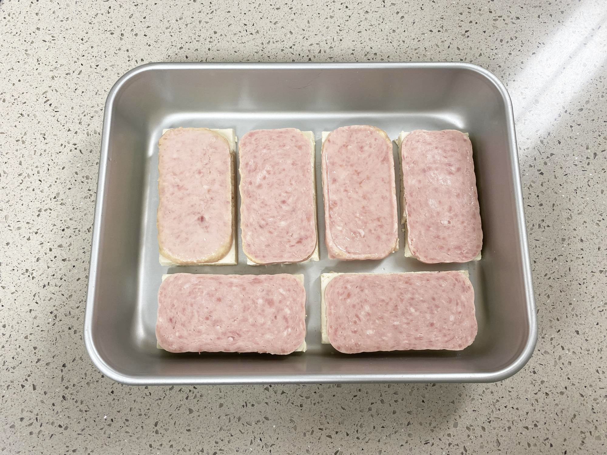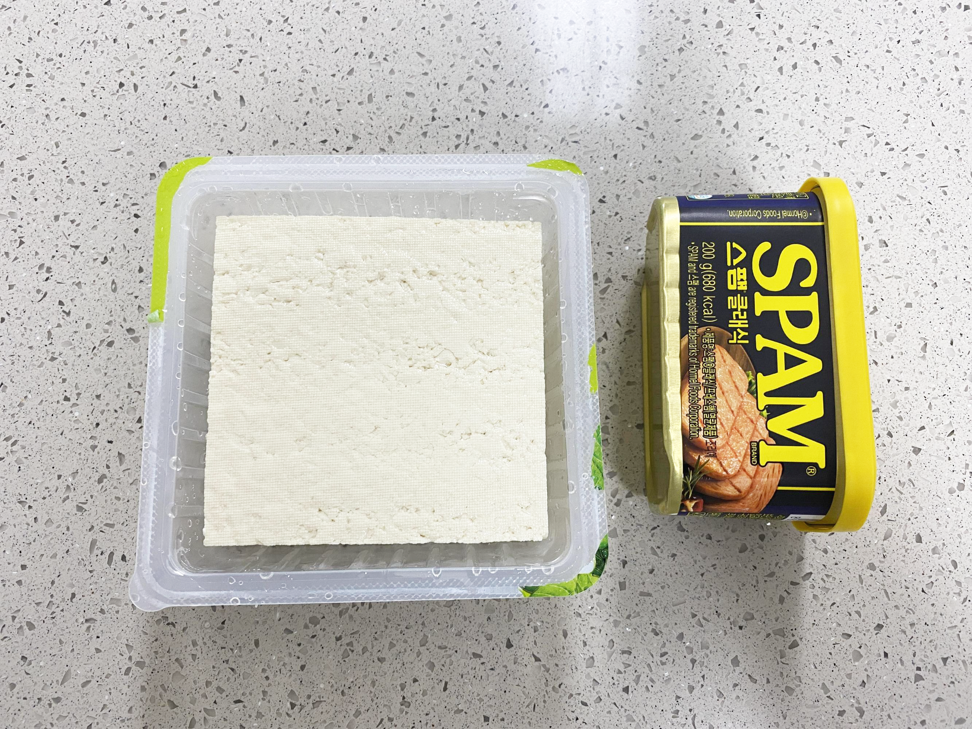 키친타월로 두부의 물기를 제거한 다음, 스팸을 올리고