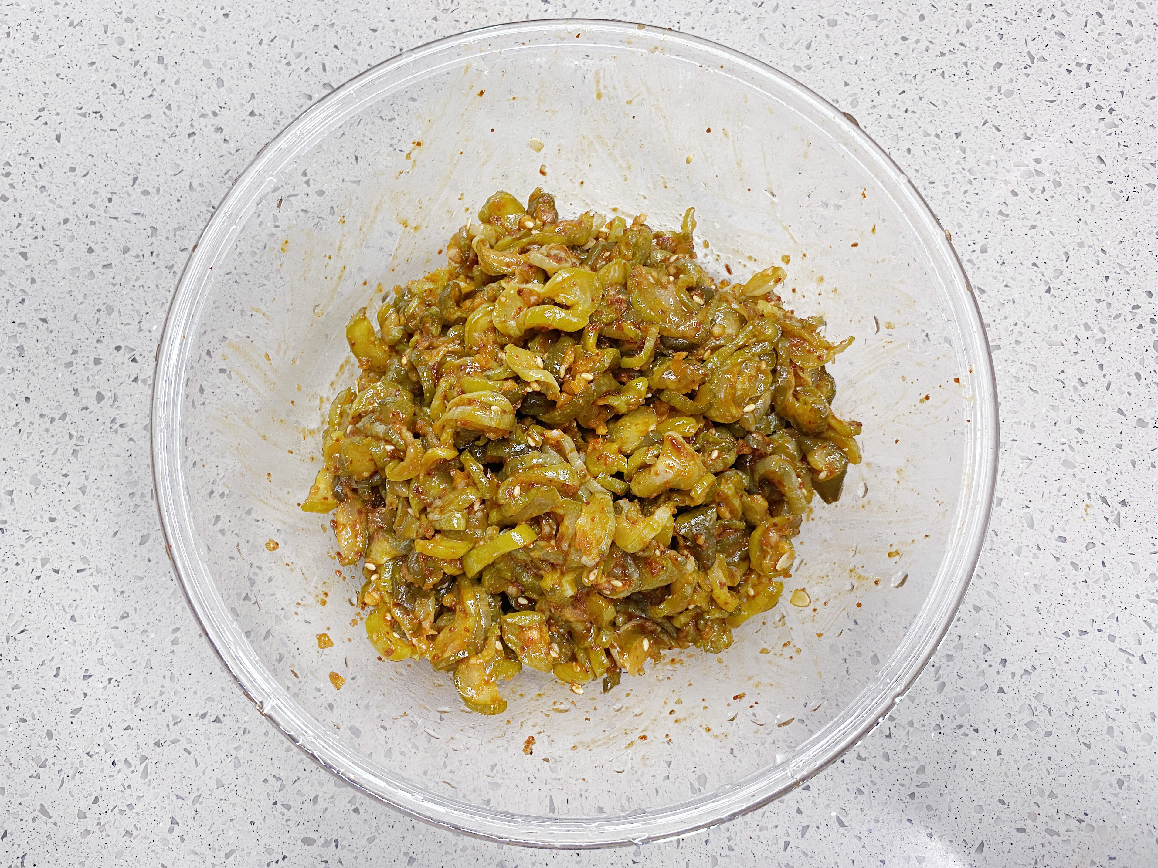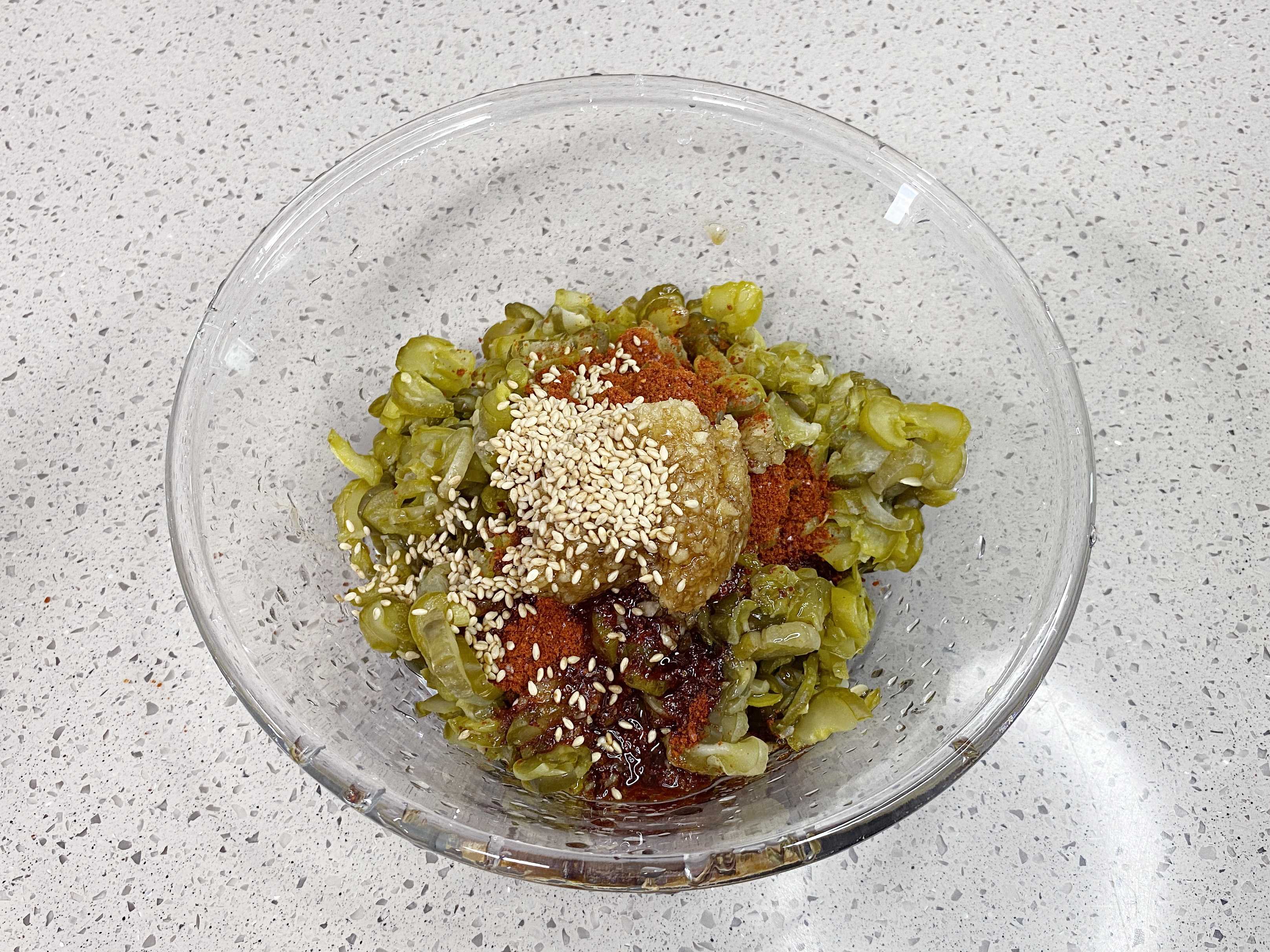 물기를 제거한 오이지를 볼에 담고 분량의 양념 [매실액 3숟갈, 고춧가루 2숟갈, 참기름 2숟갈, 간 마늘 1숟갈, 통깨]을 넣어