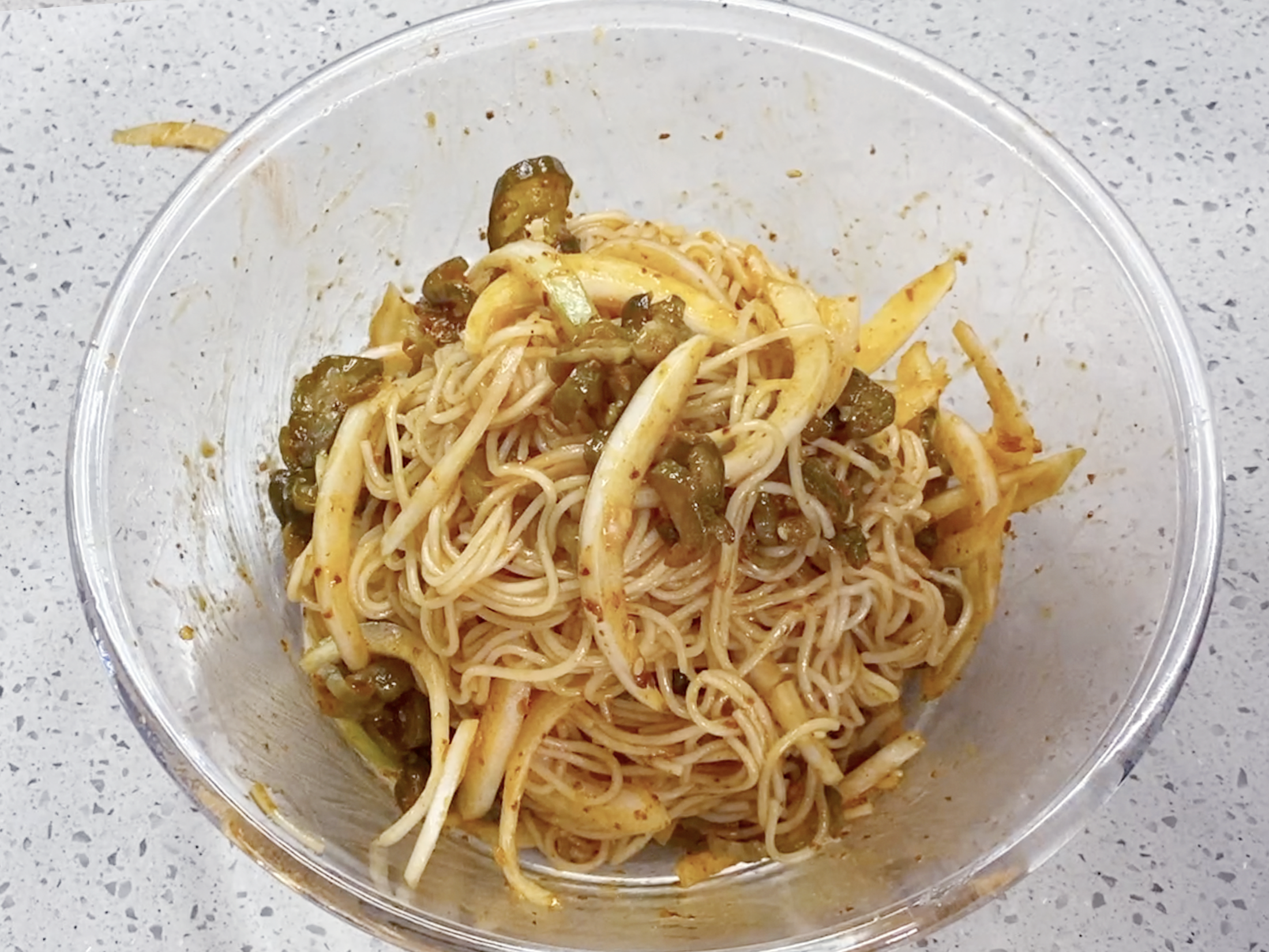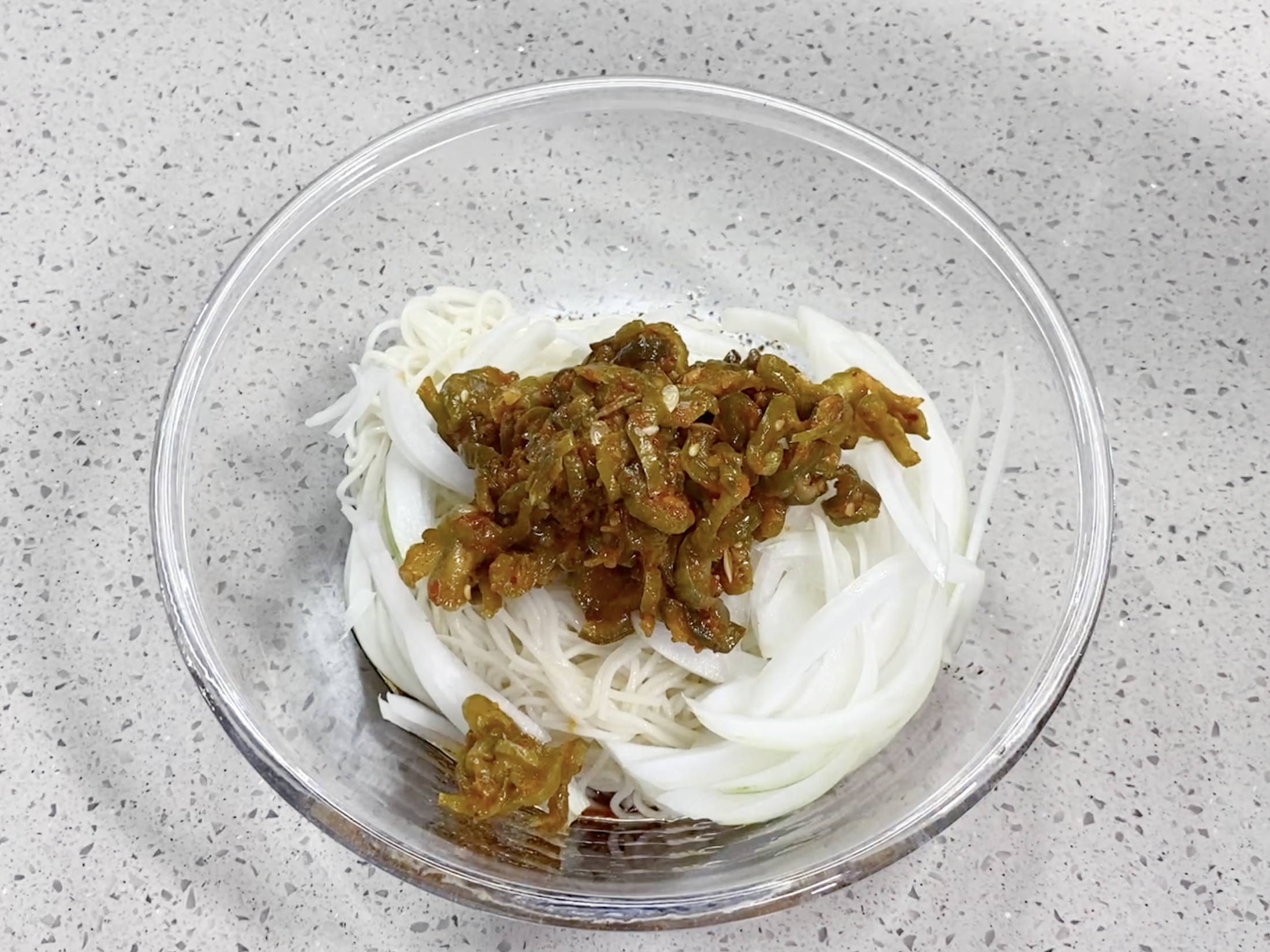 양념장에 소면과 채 썬 양파, 오이지무침 한 줌을 넣고~