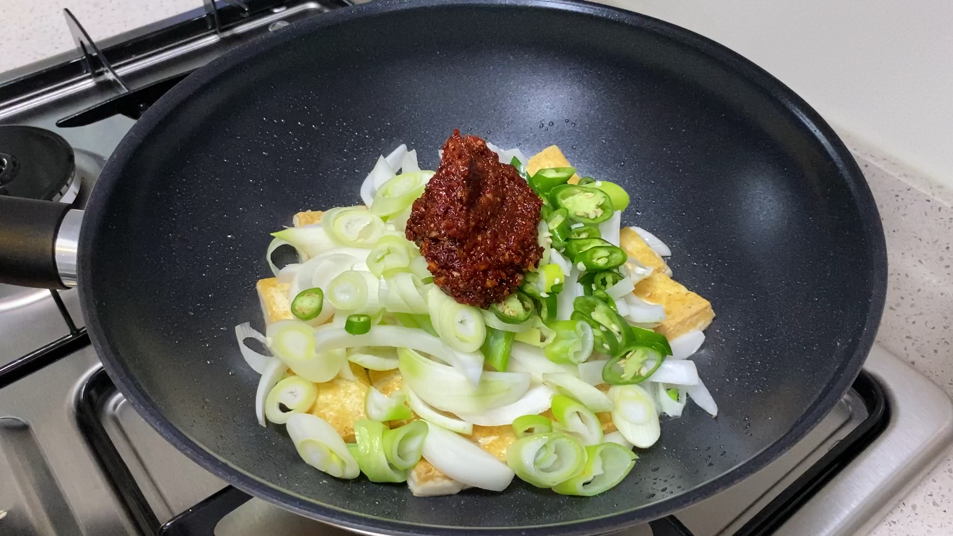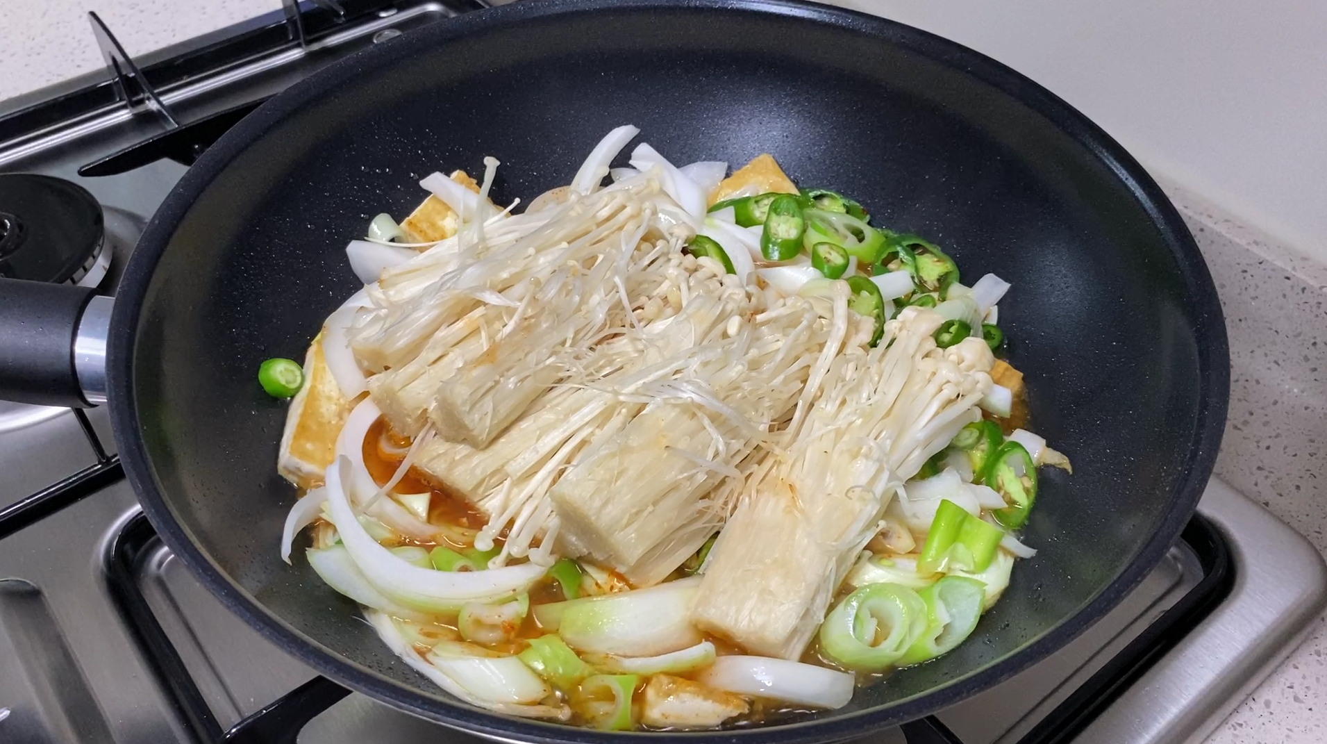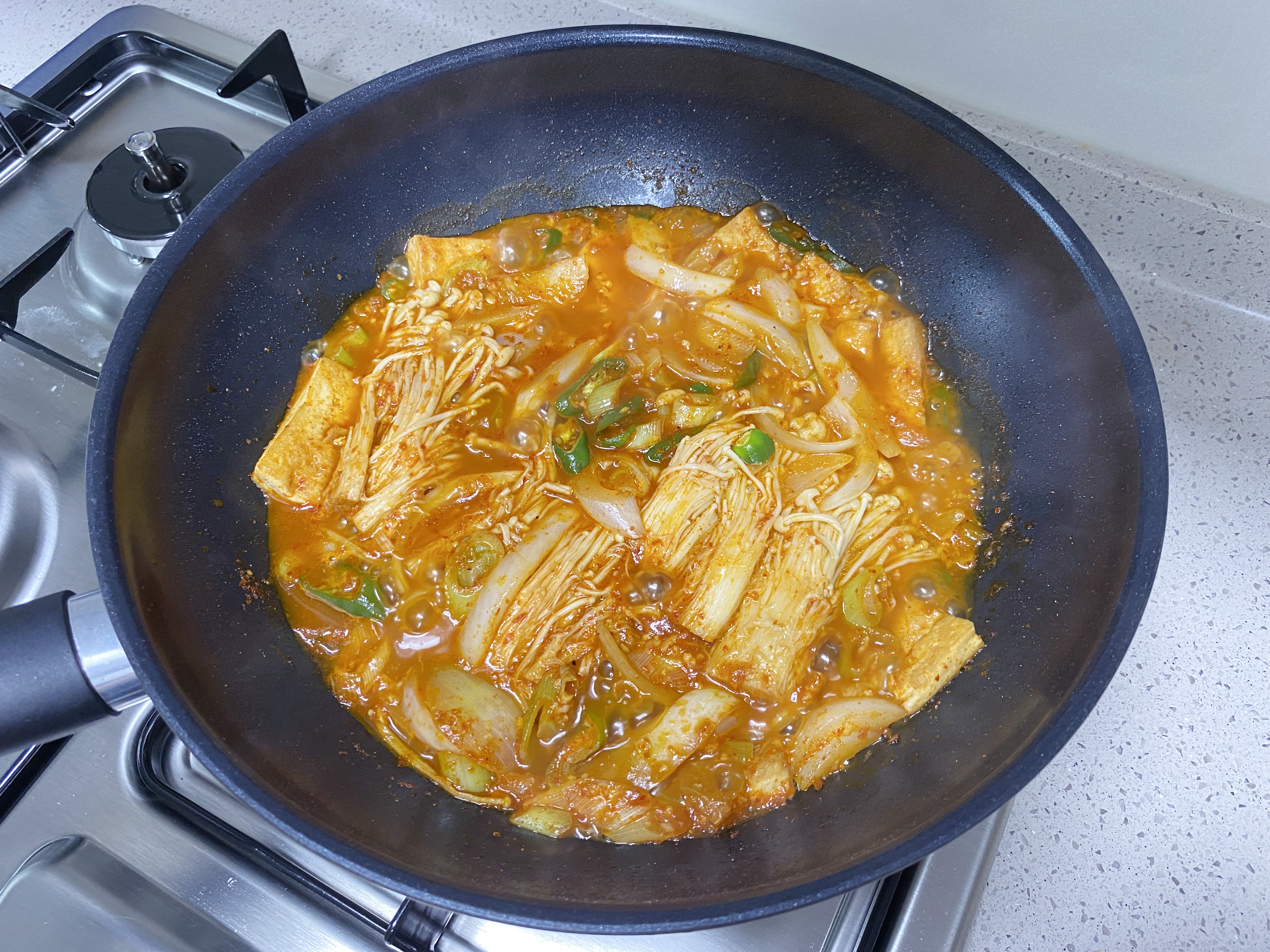 노릇하게 부쳐지면 모든 재료~ 양파, 대파, 고추, 팽이버섯, 양념장과 물 1.5컵을 붓고 바글바글 끓여 주세요~ (팽이버섯을 깜빡해서 나중에 올렸어요~ ㅎ0ㅎ)