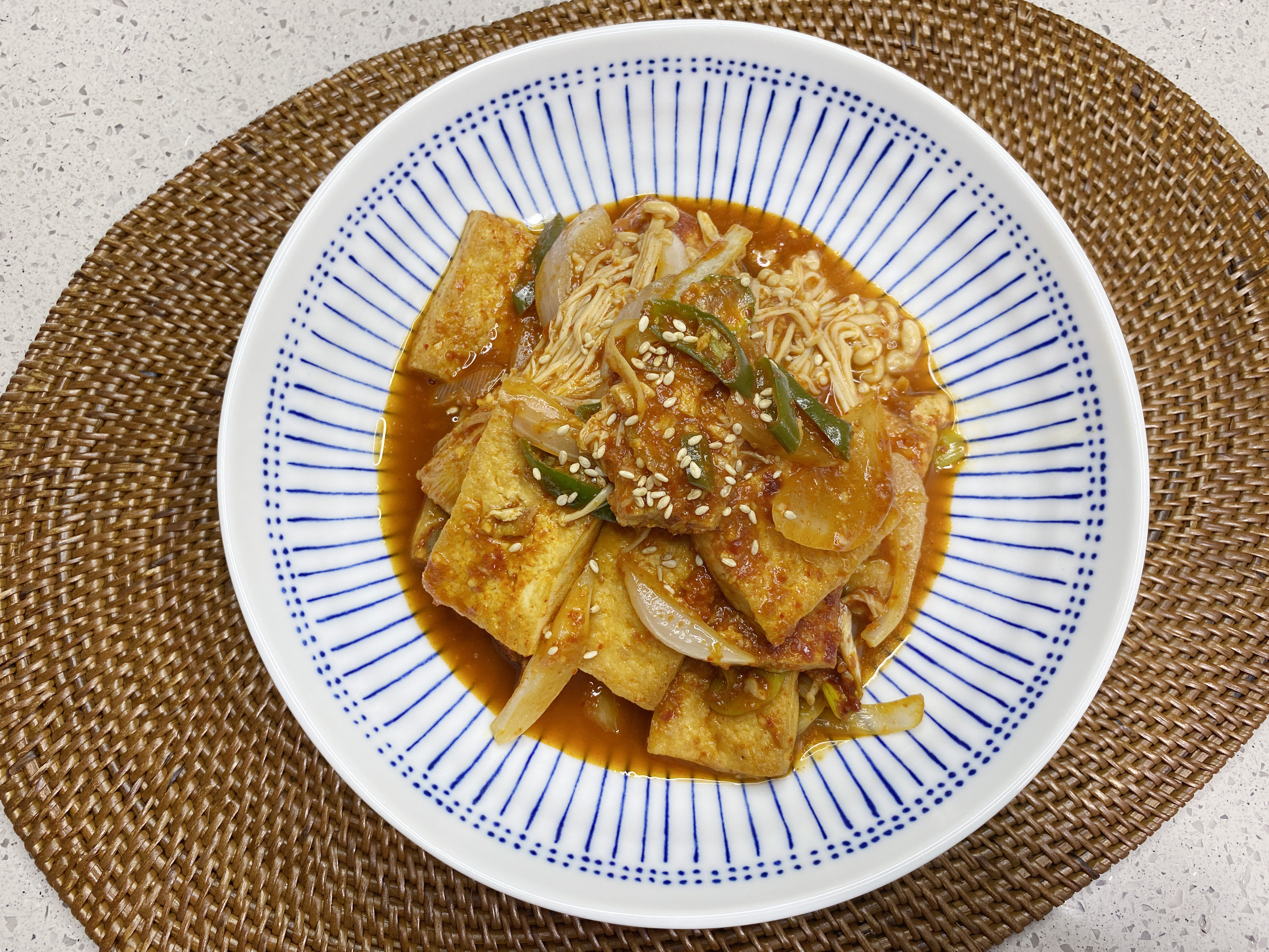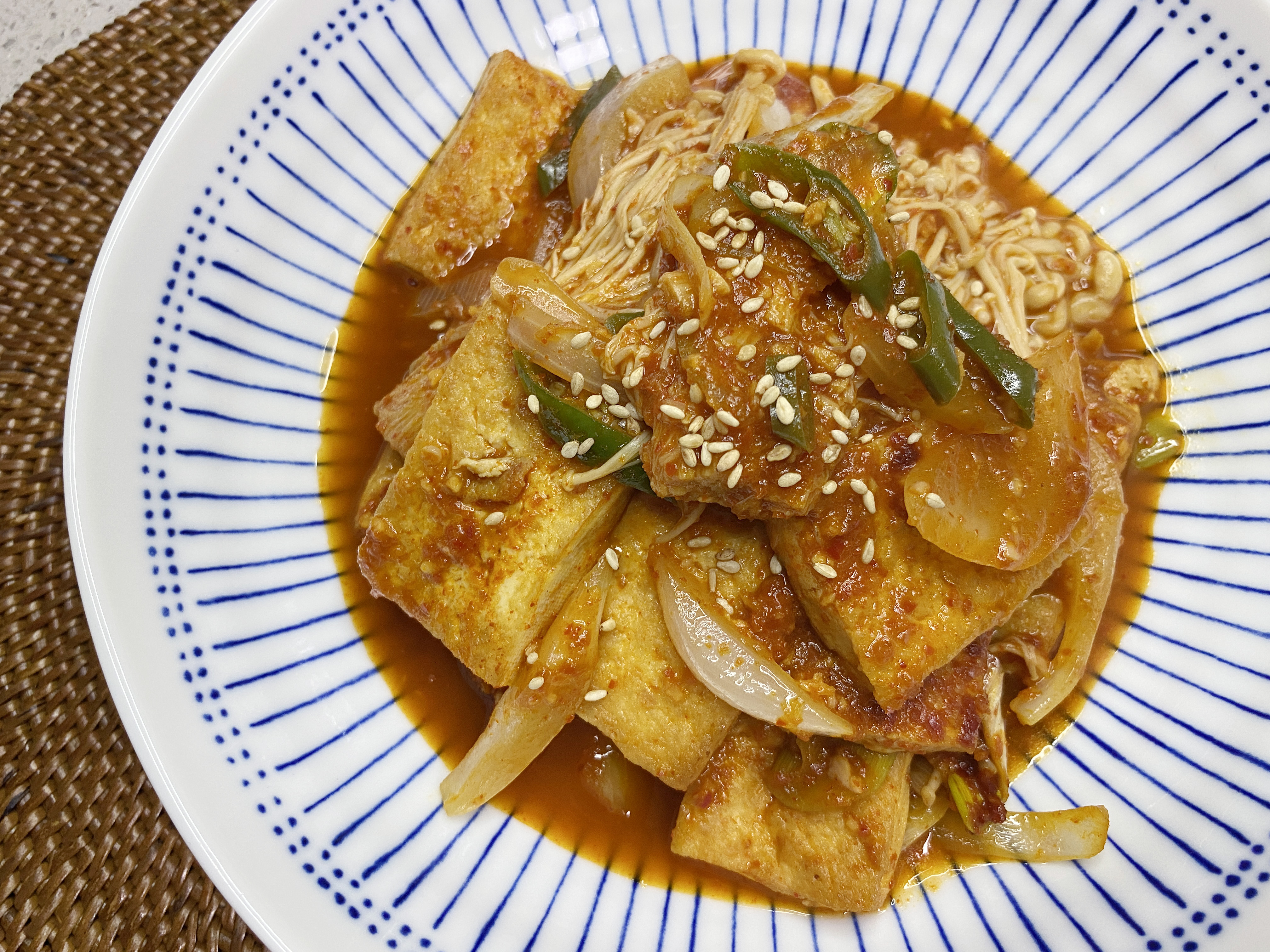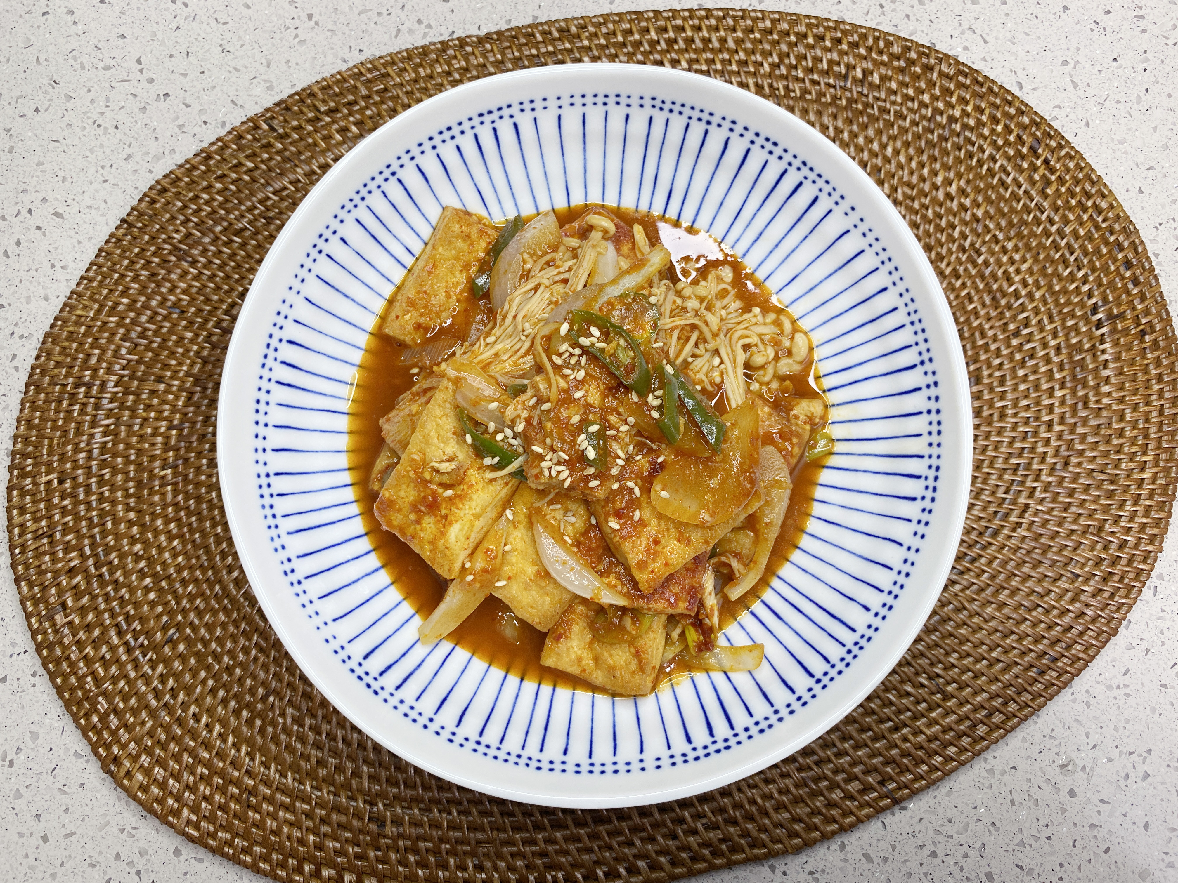 노릇하게 부쳐지면 모든 재료~ 양파, 대파, 고추, 팽이버섯, 양념장과 물 1.5컵을 붓고 바글바글 끓여 주세요~ (팽이버섯을 깜빡해서 나중에 올렸어요~ ㅎ0ㅎ)