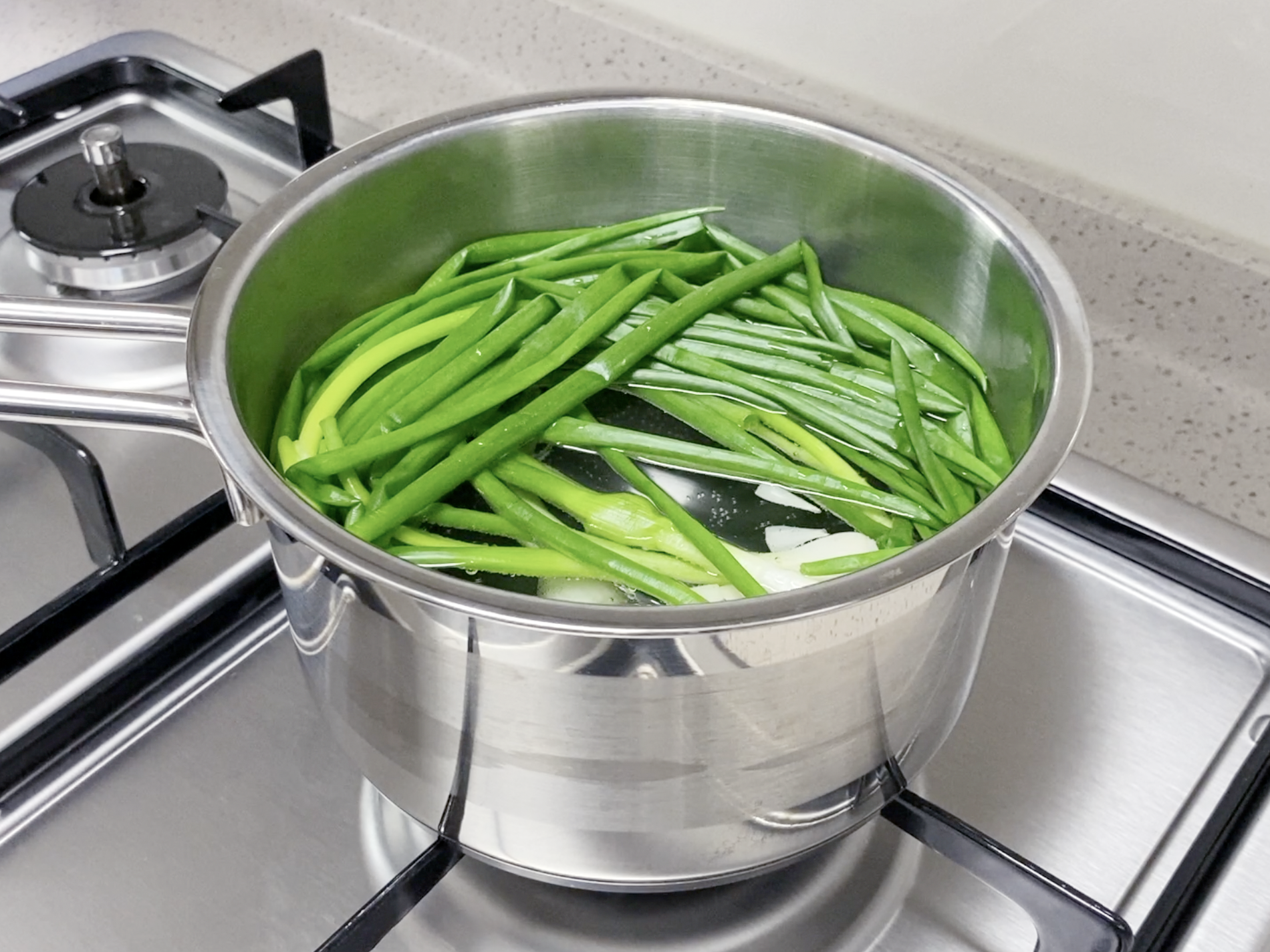 끓는 물에 쪽파 뿌리부터 넣고 약 30초간 데친 다음, 찬물에 헹궈 물기를 빼줍니다.