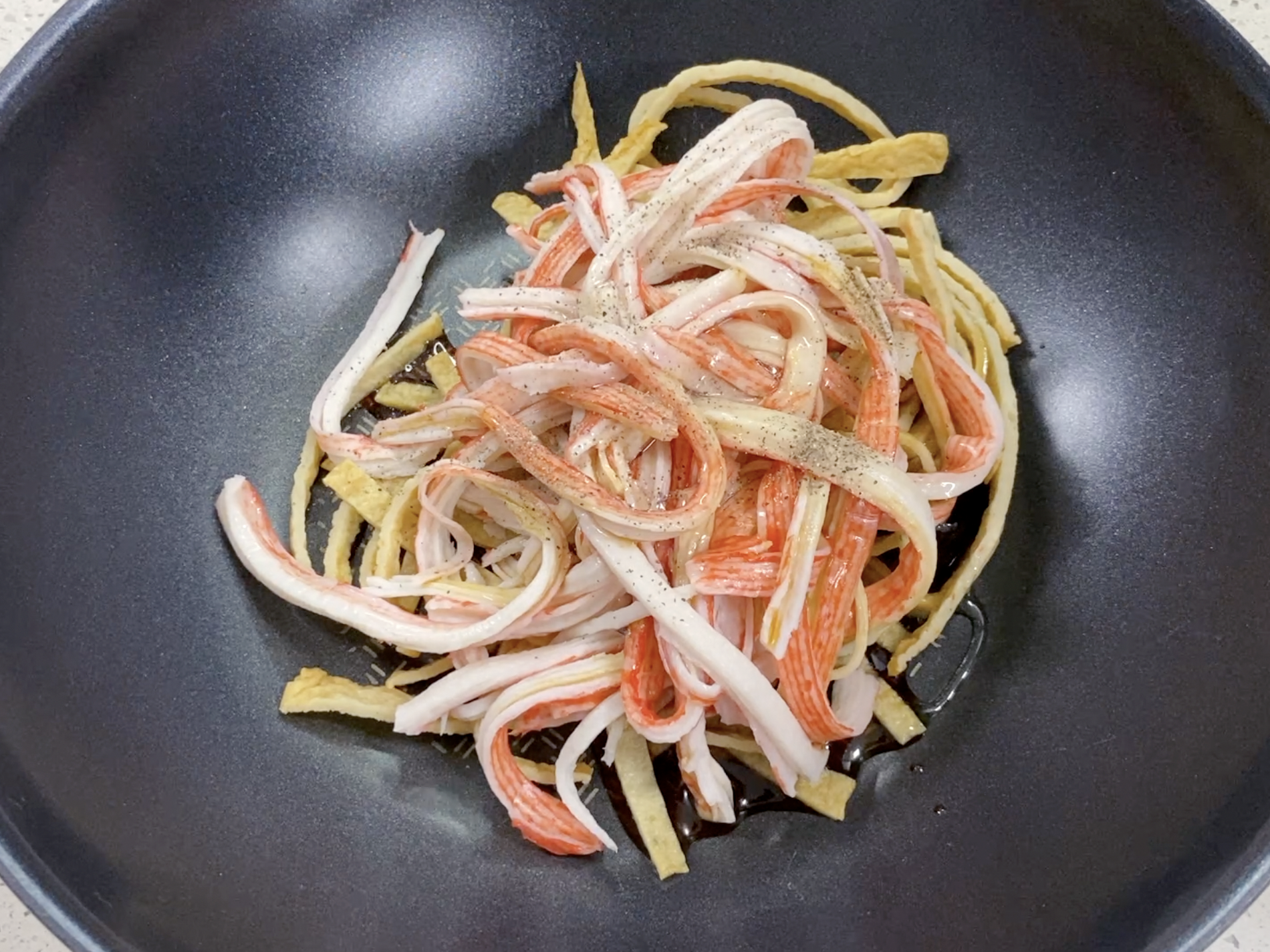 어묵은 말아서 길쭉하게 썰고, 맛살은 찢어서 준비합니다.