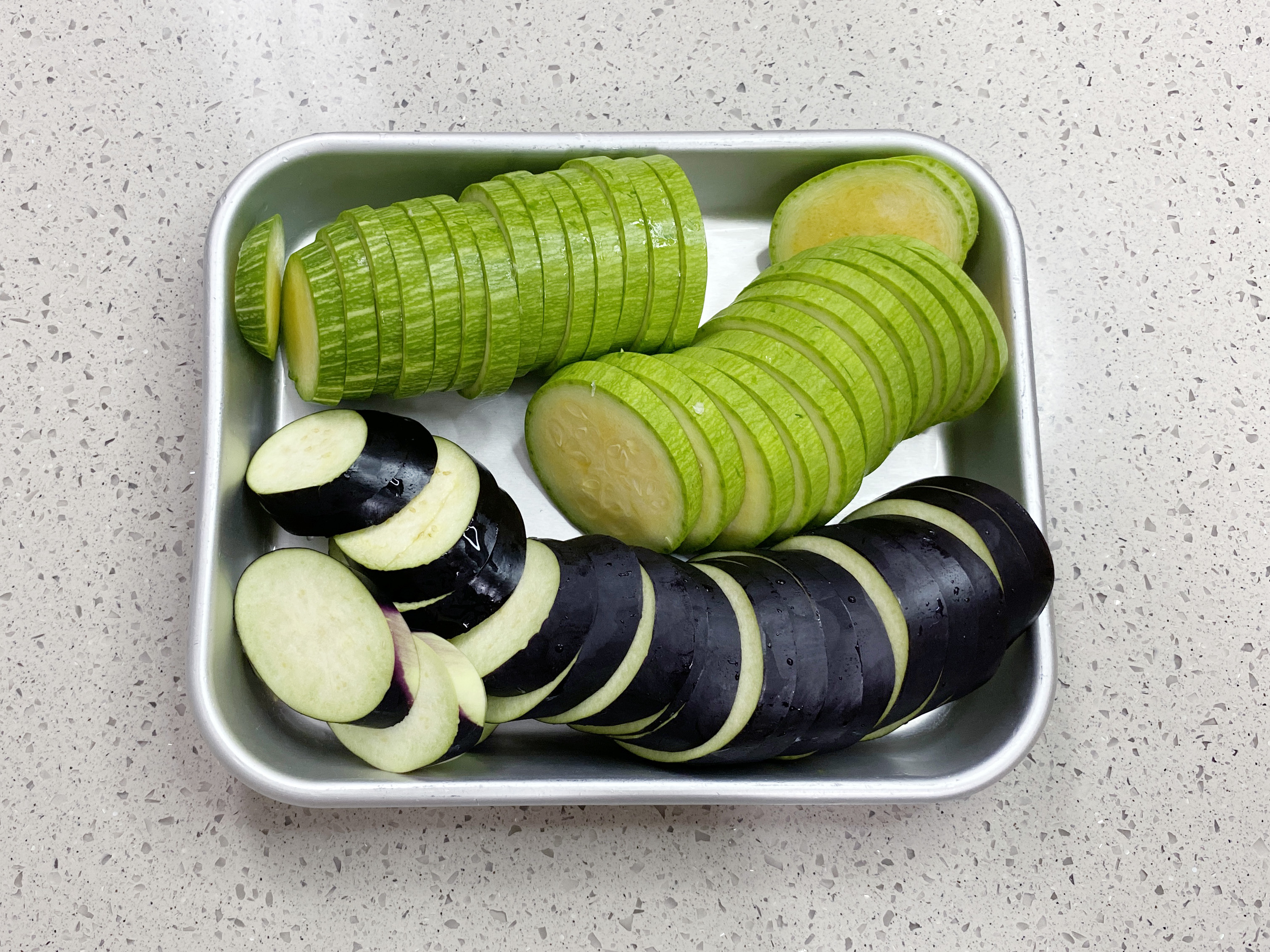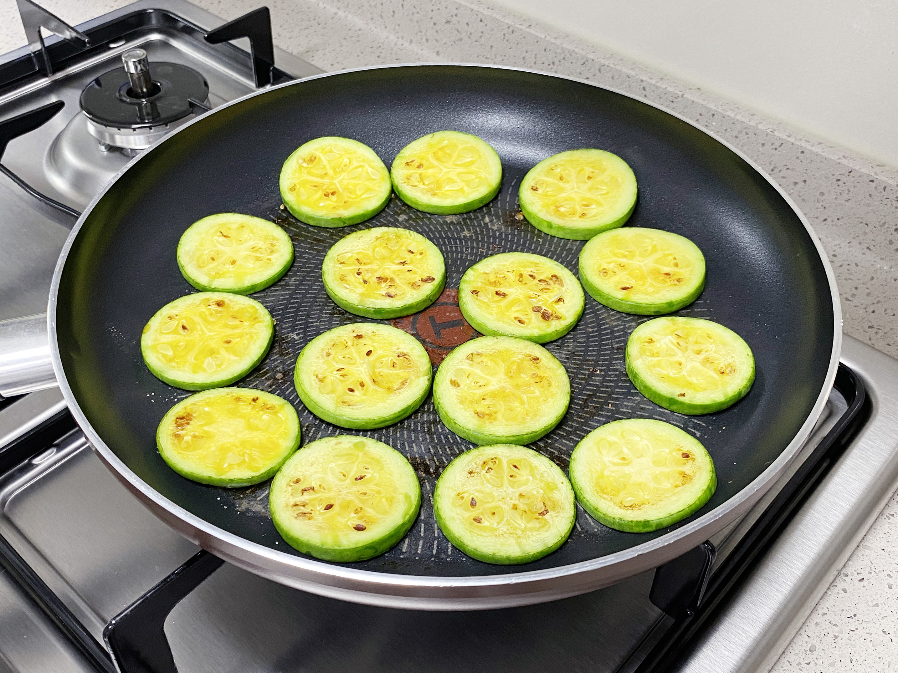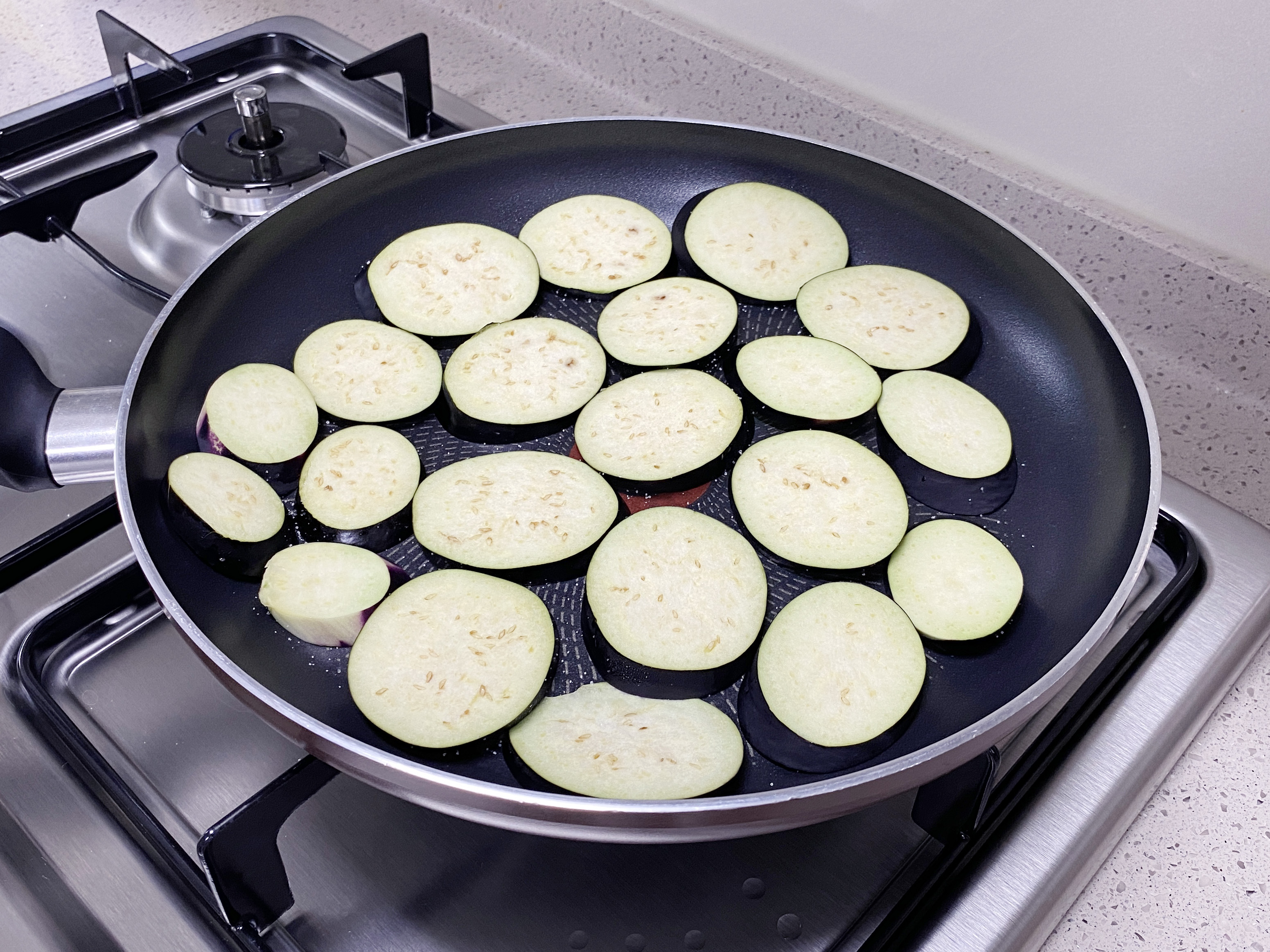 가지를 먼저 구워주시는 게 좋아요~ 애호박에서 채즙이 나와서.. 팬을 다시 닦아야 한다는.. ㅎㅎ