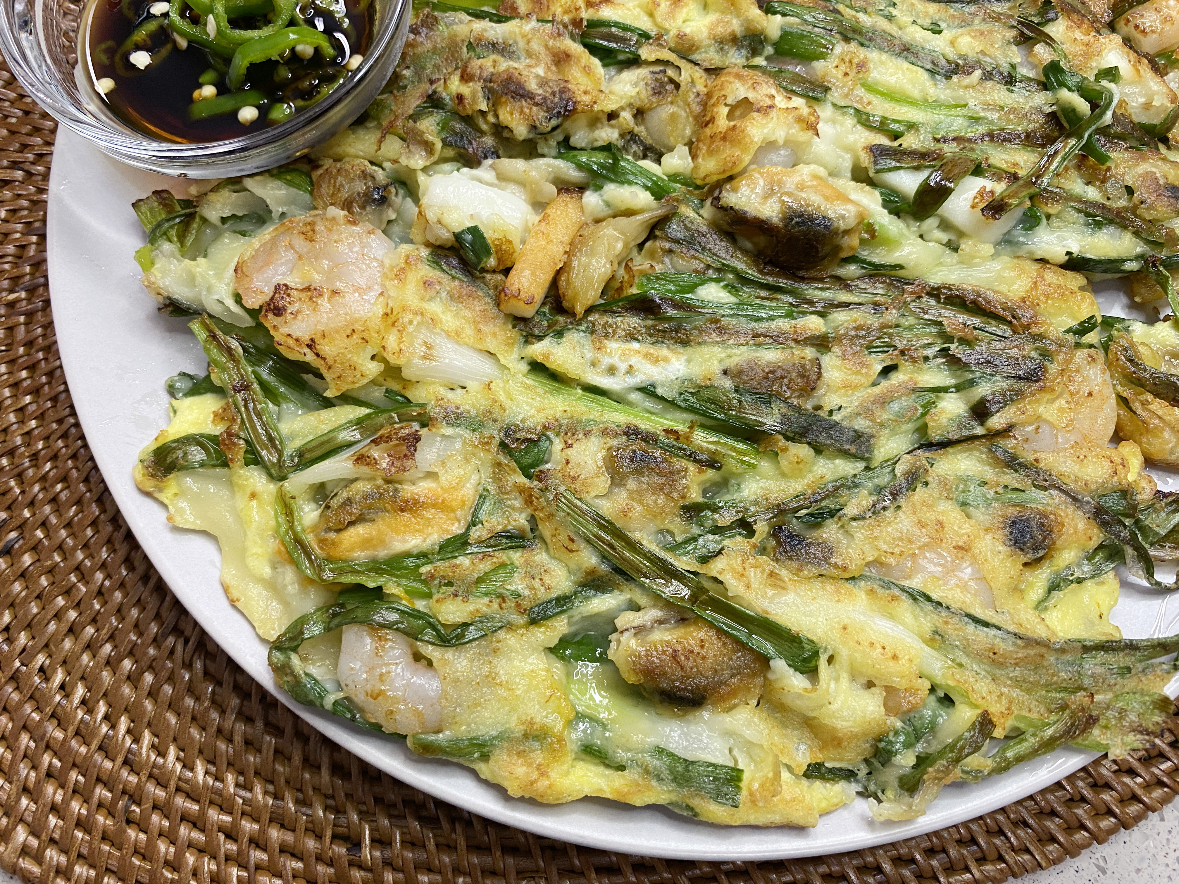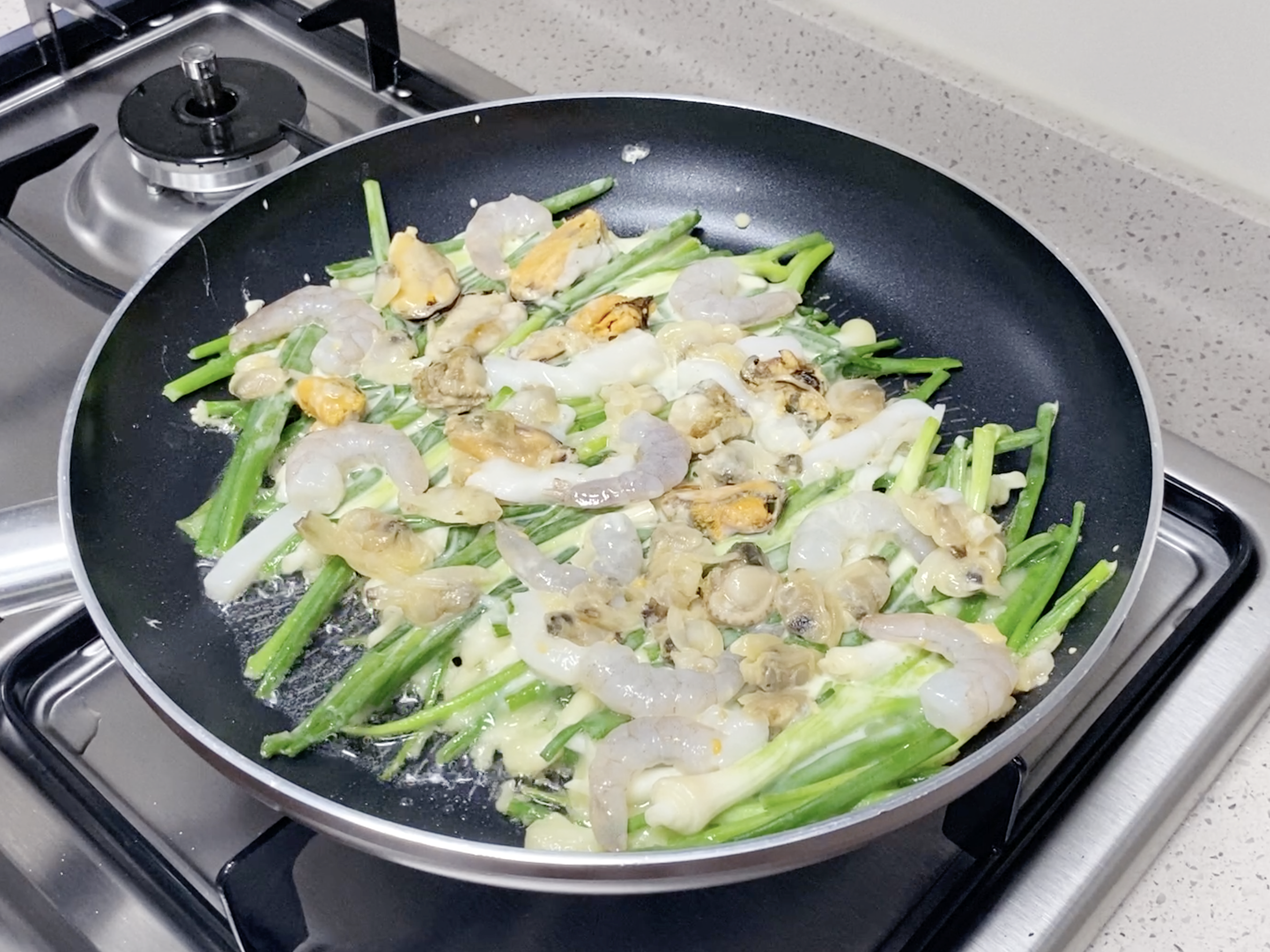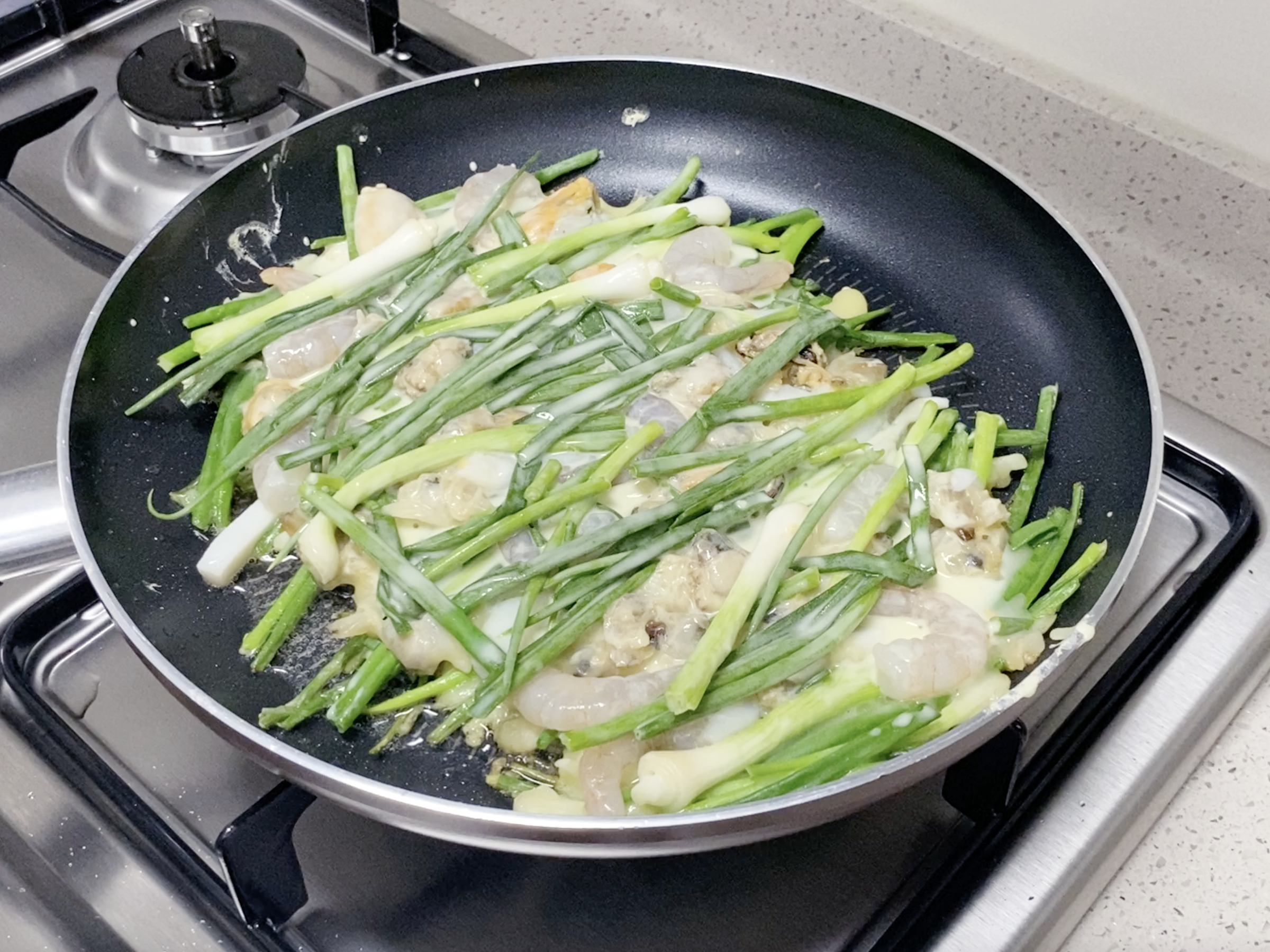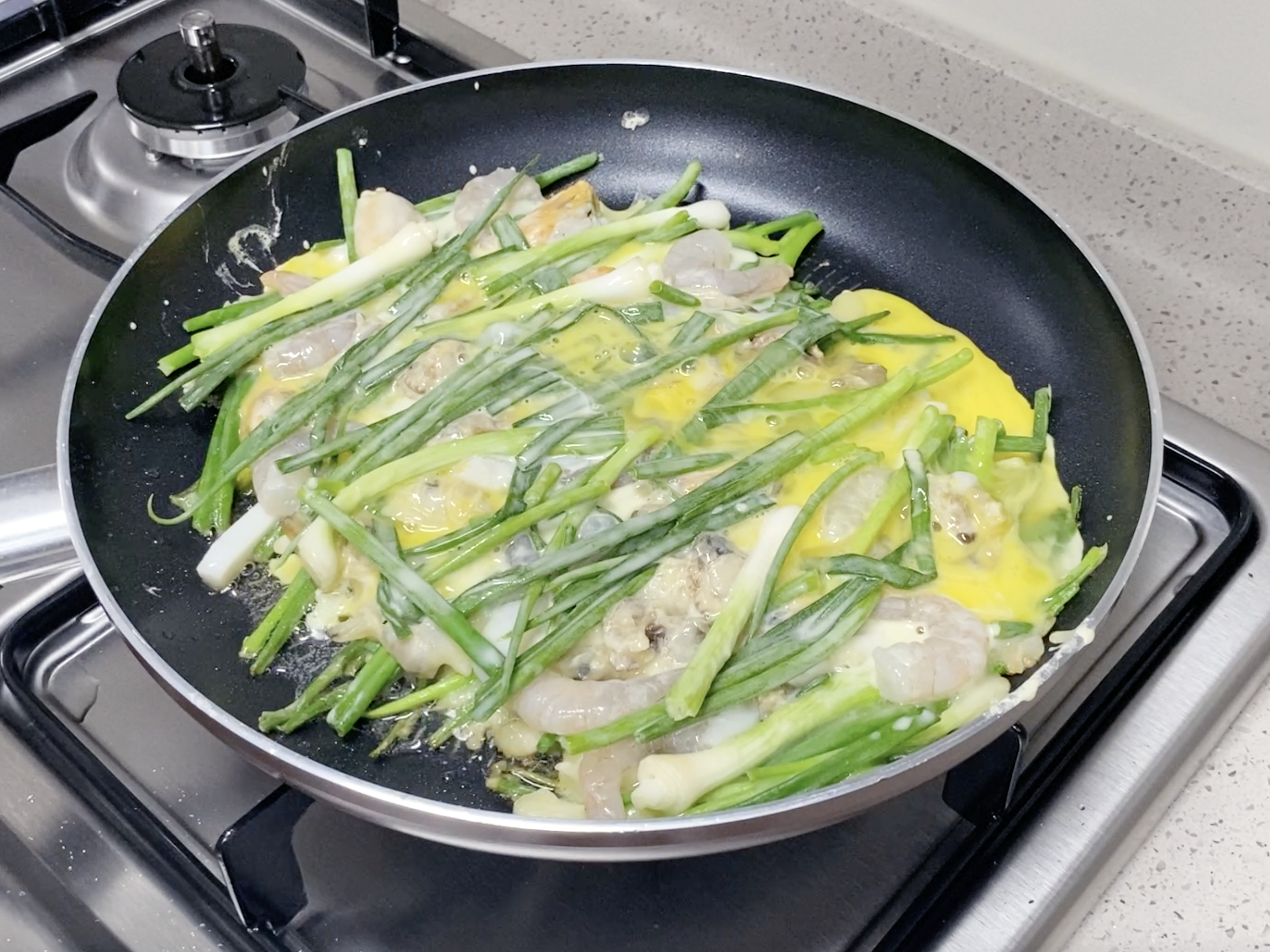 해물이 떨어지지 않게 달걀을 풀어 발라 줍니다. (저는 반죽도 남아서 올린 다음 달걀물을 올려 주었네요~ )