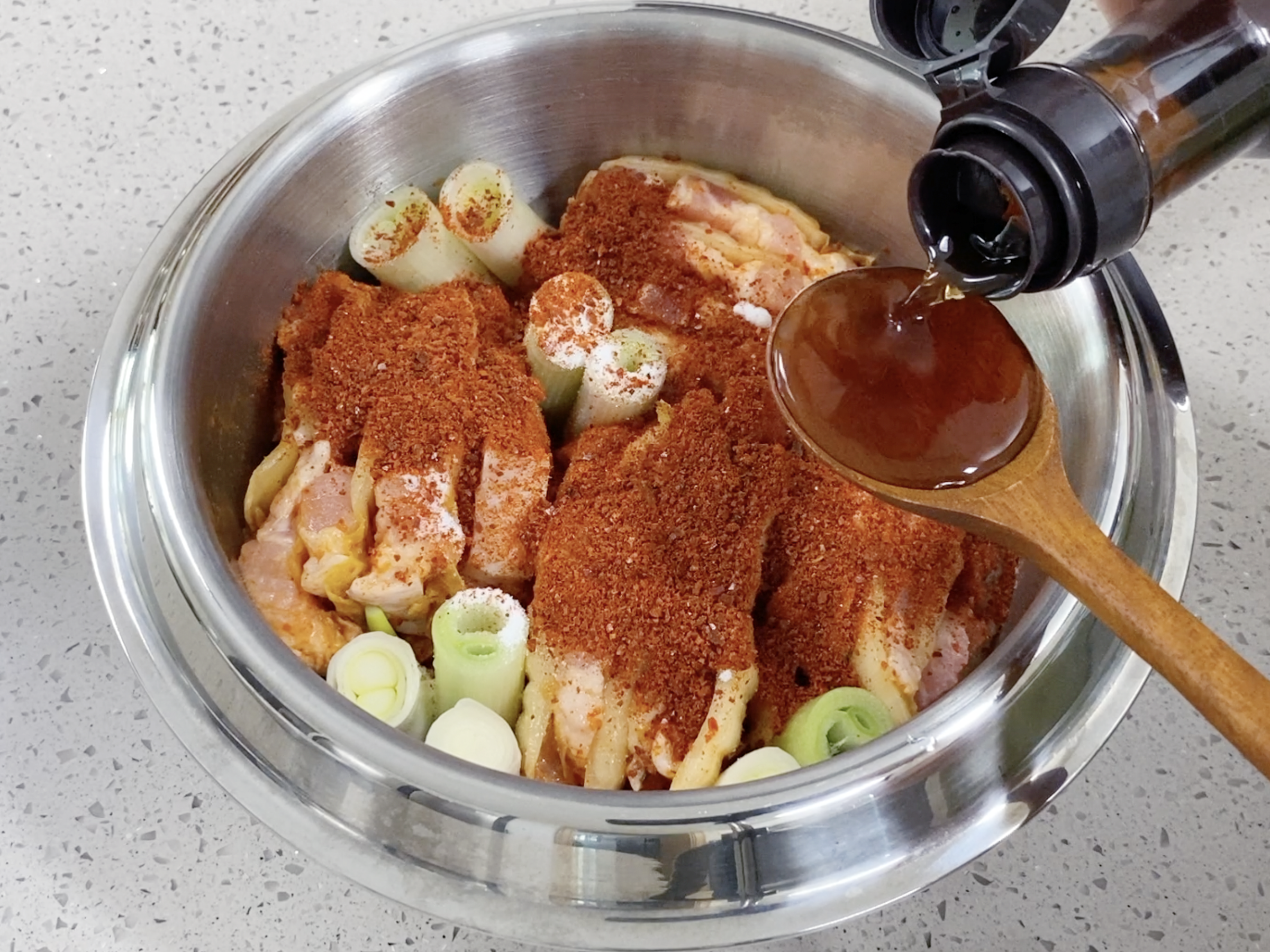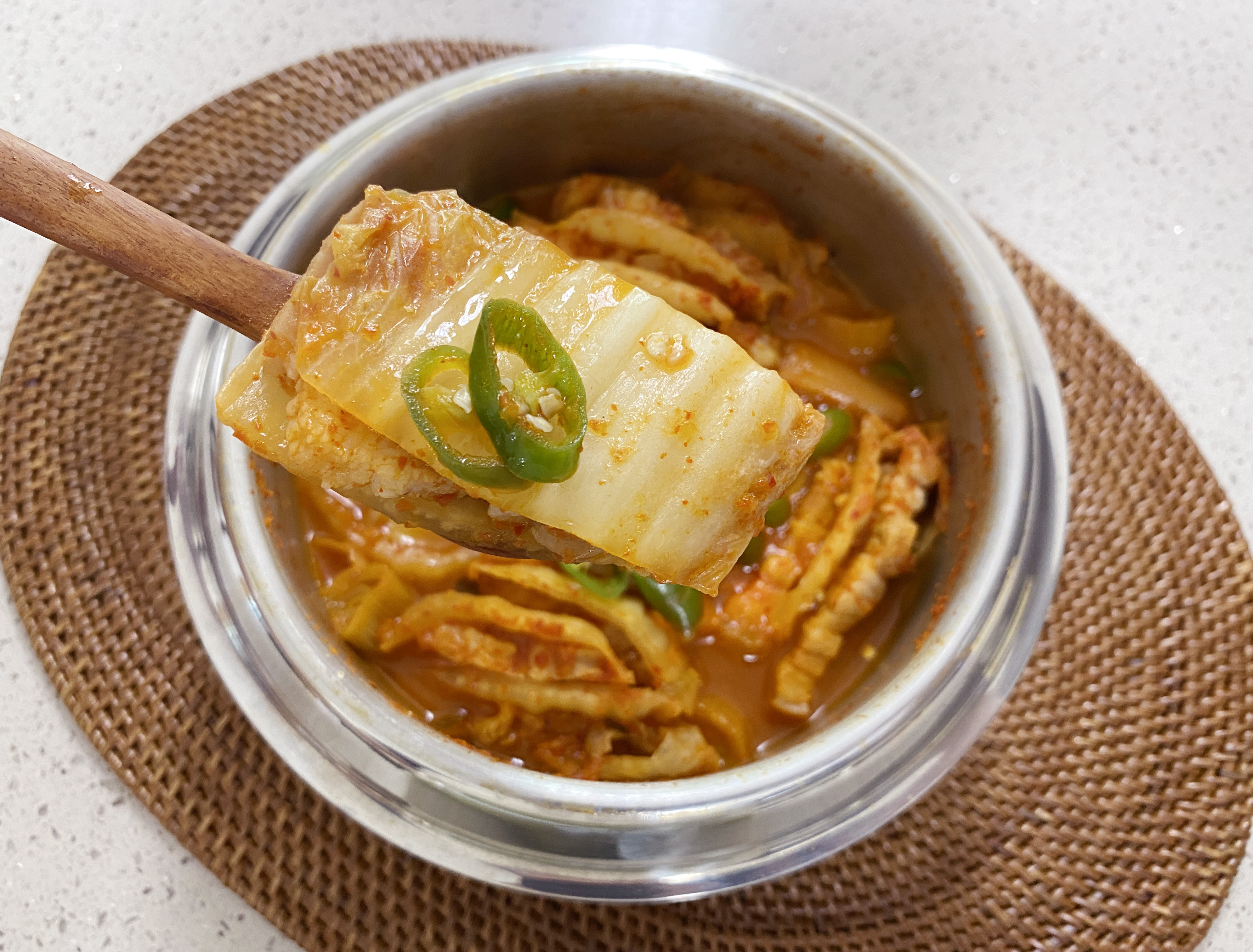 이제 설탕 0.5숟갈, 고춧가루 1.5숟갈, 참치액 1숟갈, 멸치다시마국물(샘표국시장국) 3숟갈을 넣고