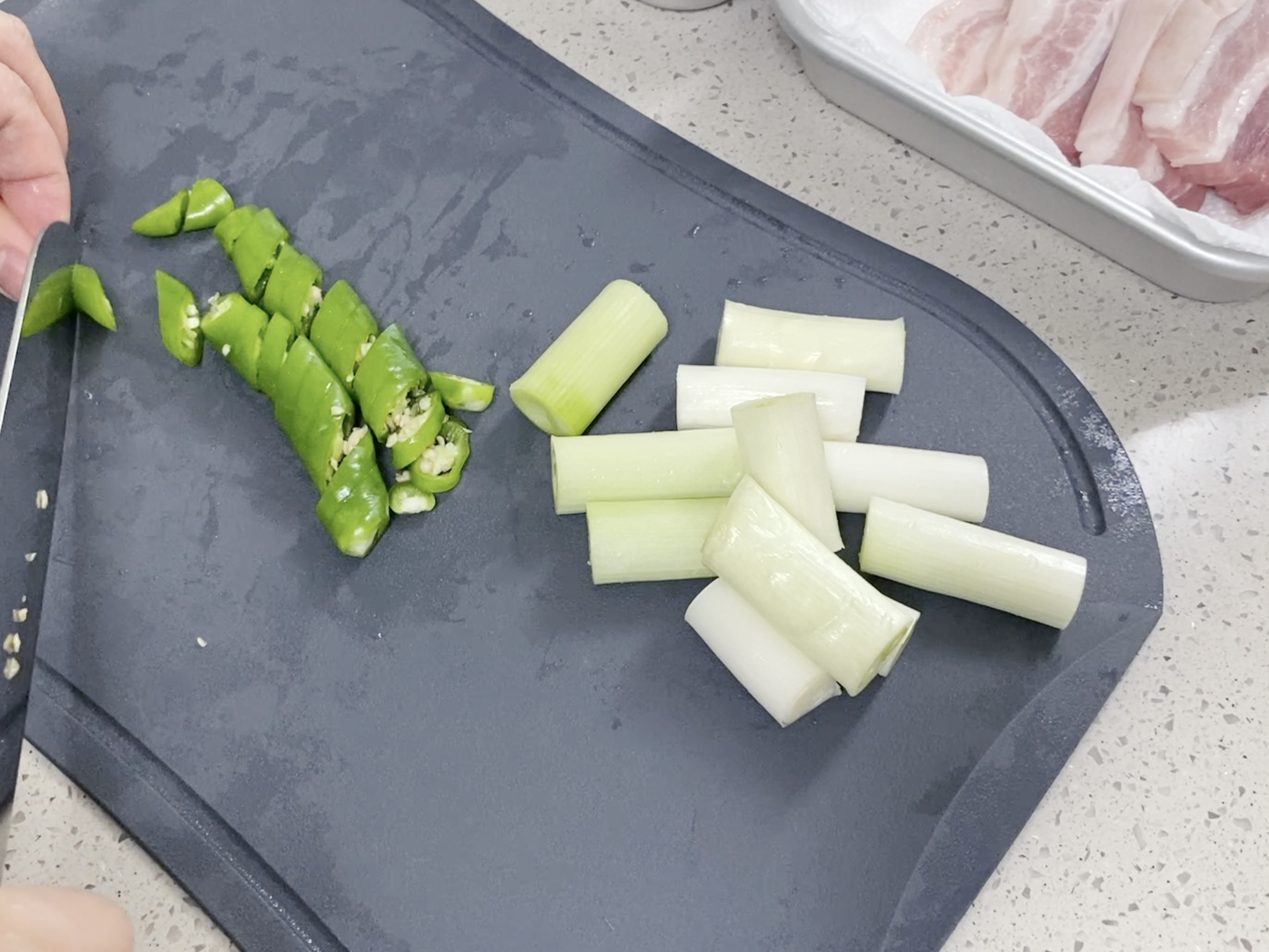 청양고추는 어슷 썰고, 대파는 큼직하게 썰어 줍니다. (김치와 같은 크기로~)