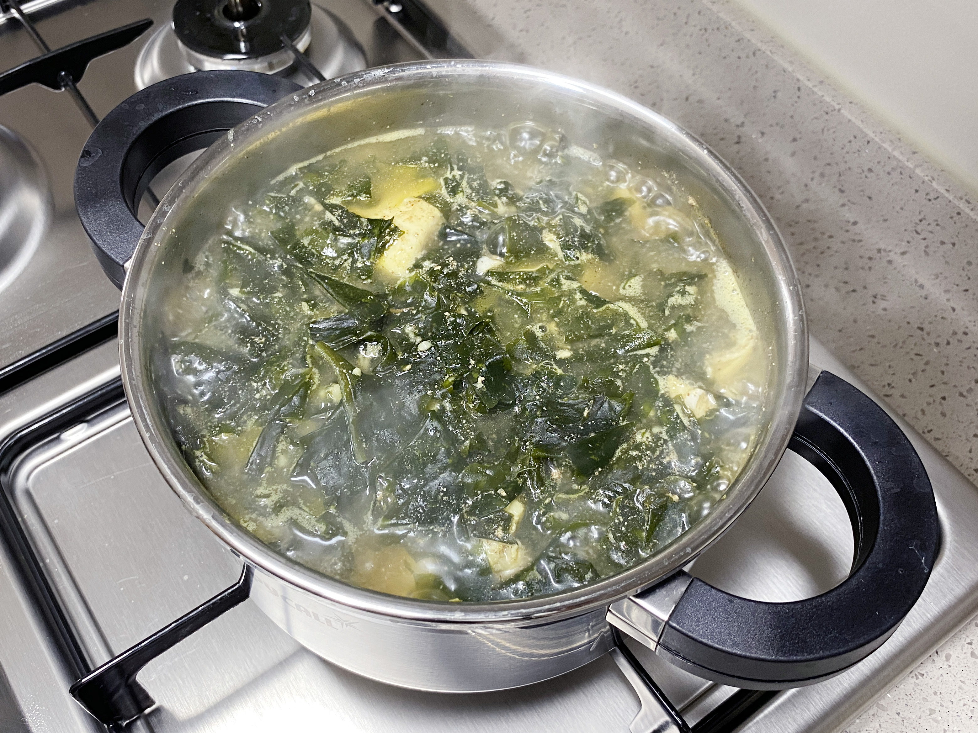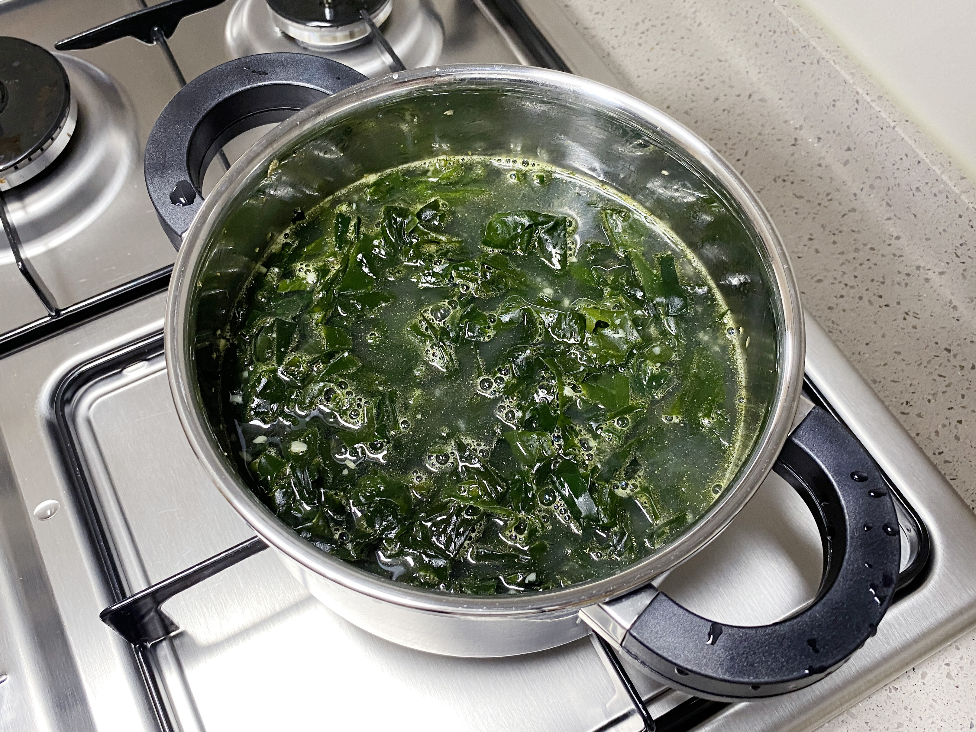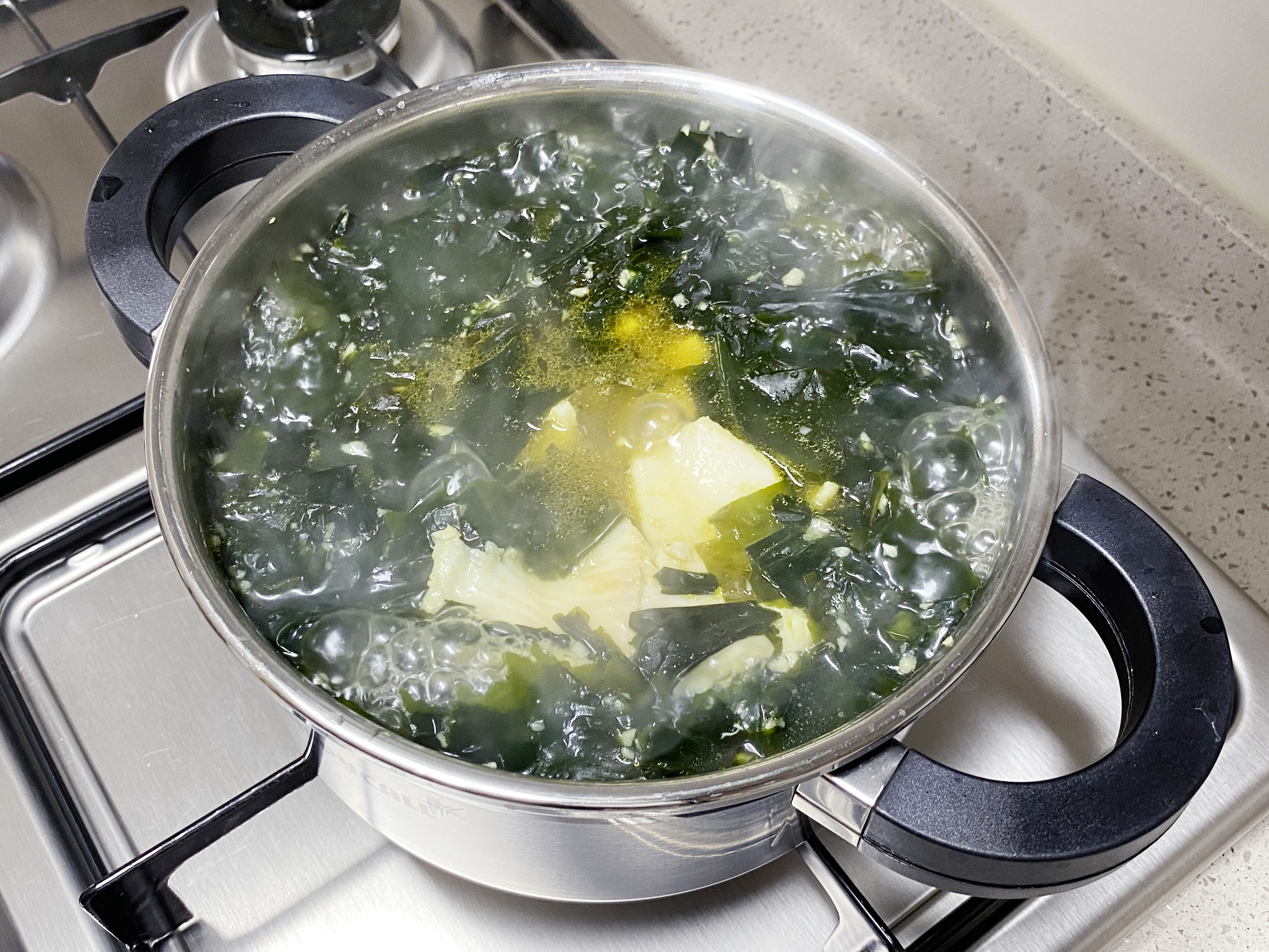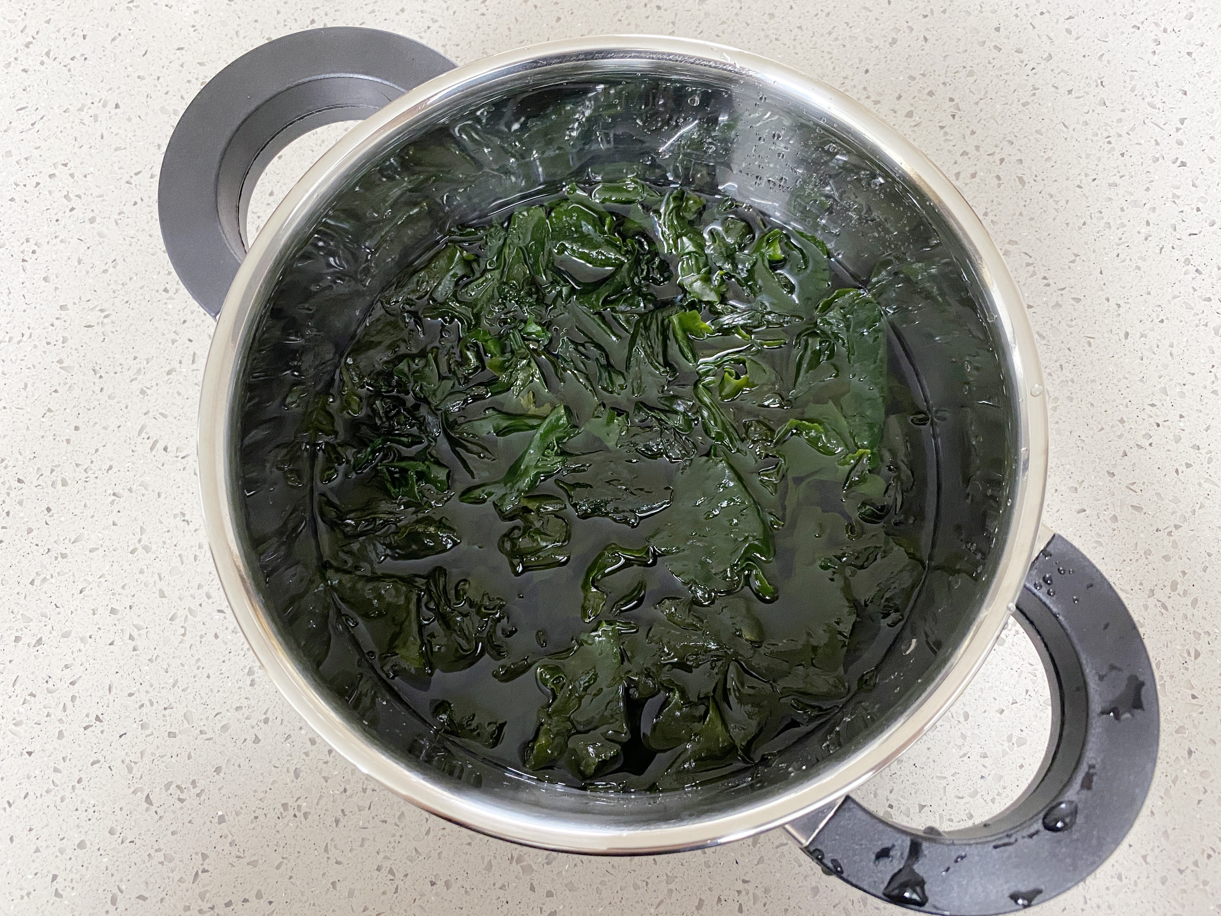 자른 미역을 끓일 냄비에 넣고 약 10분간 불립니다.