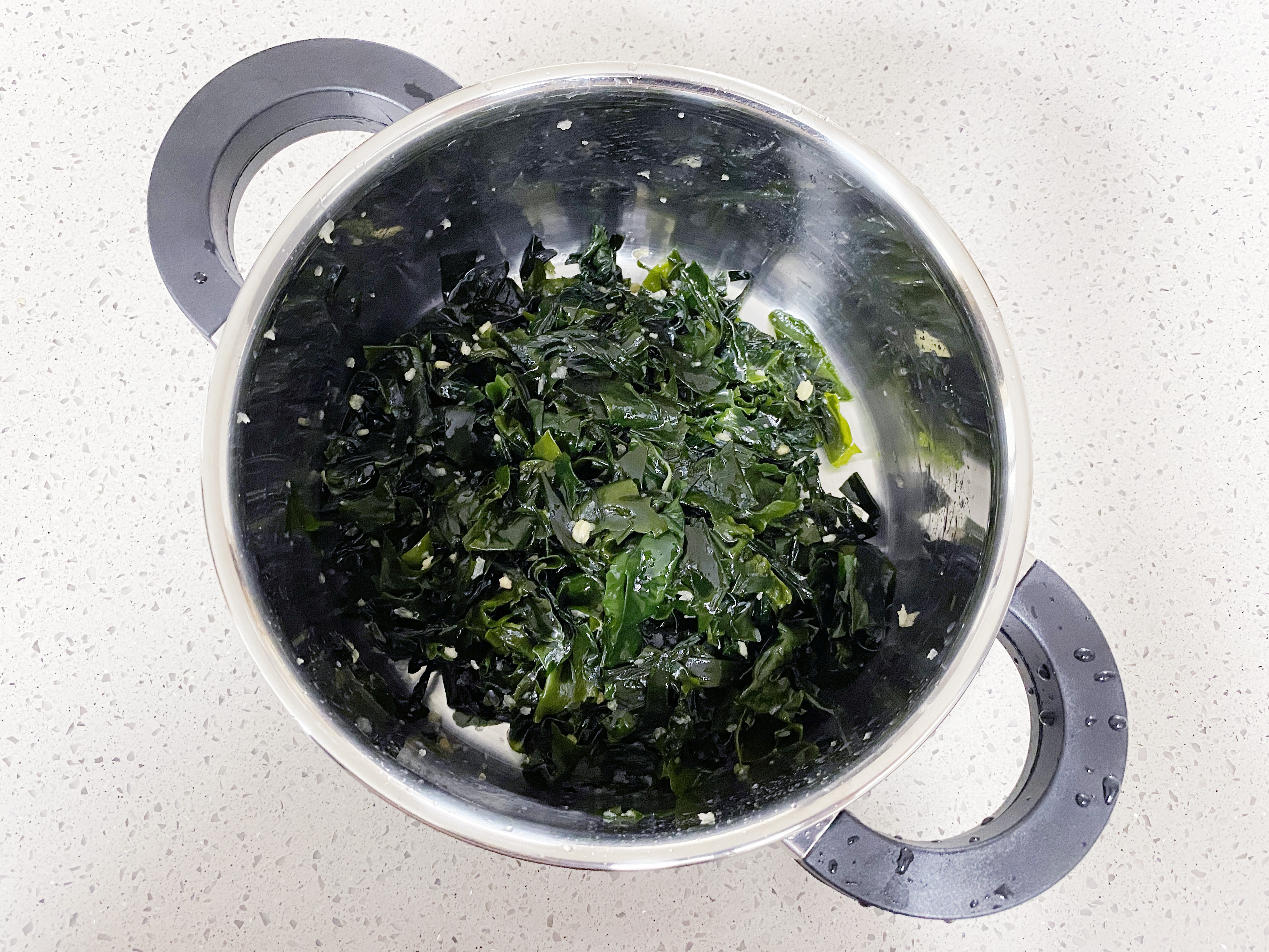 불린 미역을 헹궈서 물기를 제거한 다음 참치액 2숟갈, 간 마늘 1숟갈을 넣고 버무립니다. (참치액이 없으면 액젓으로~)
