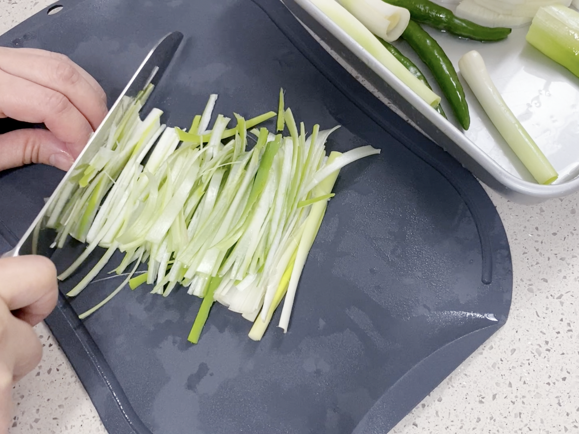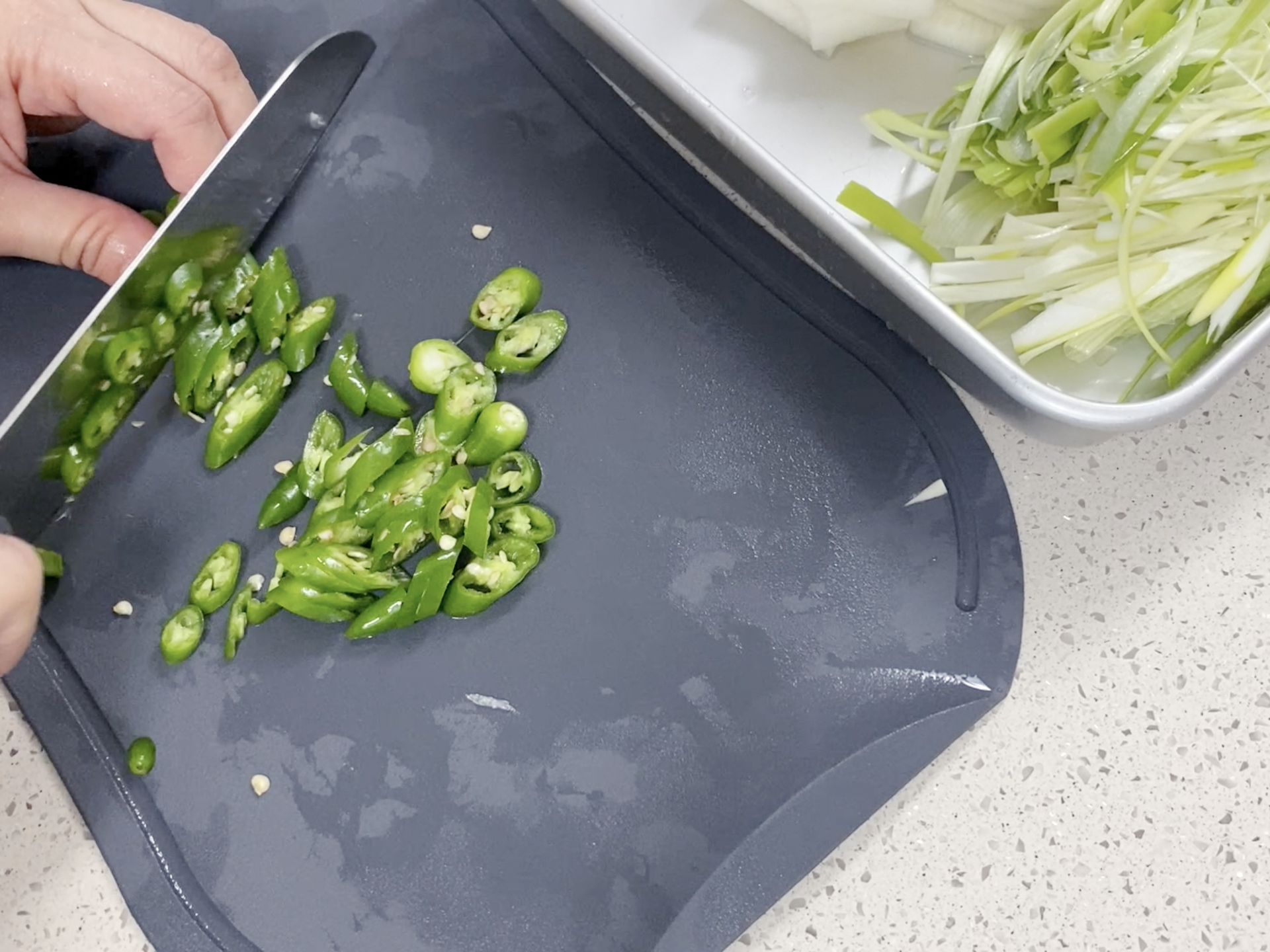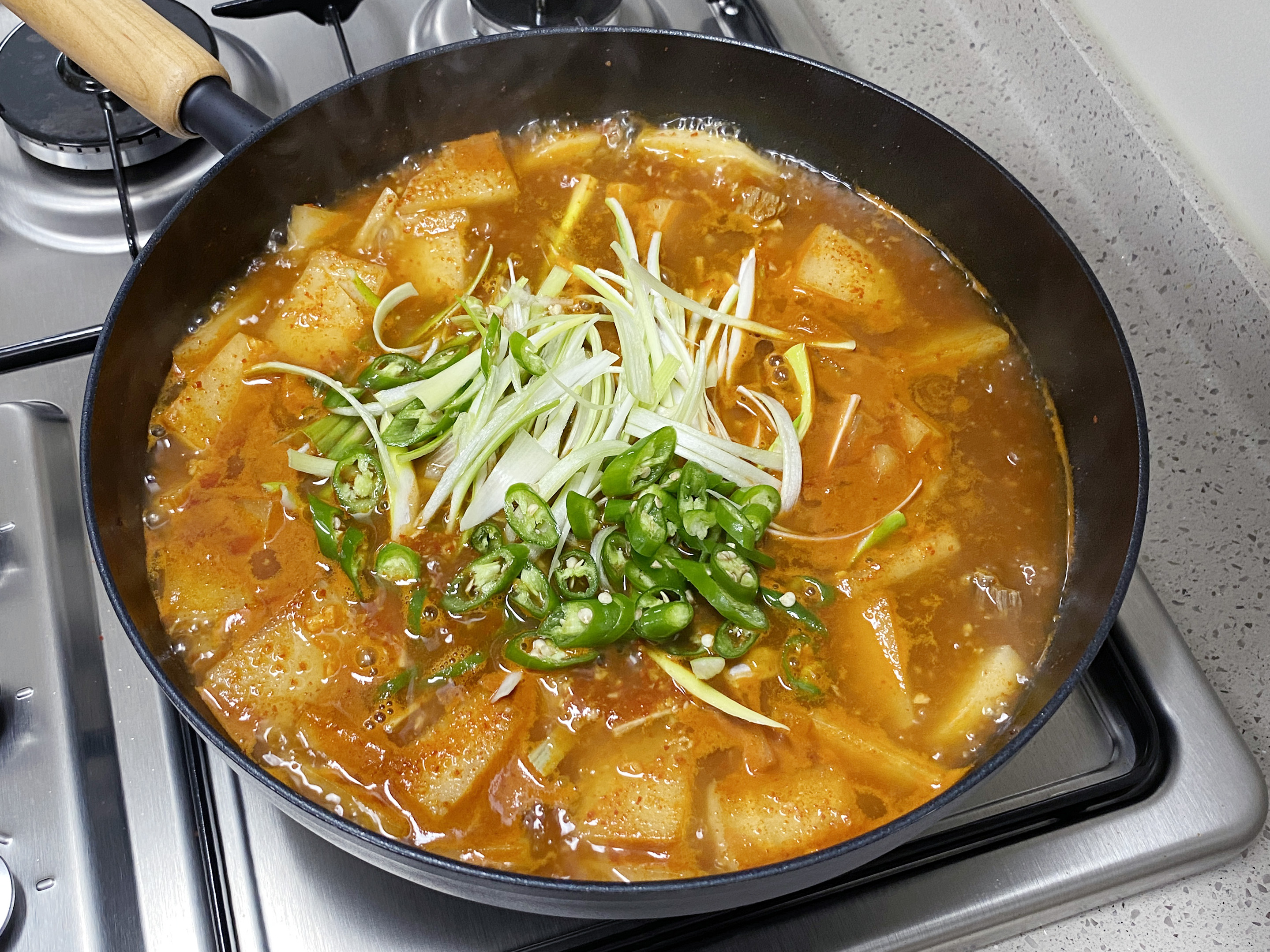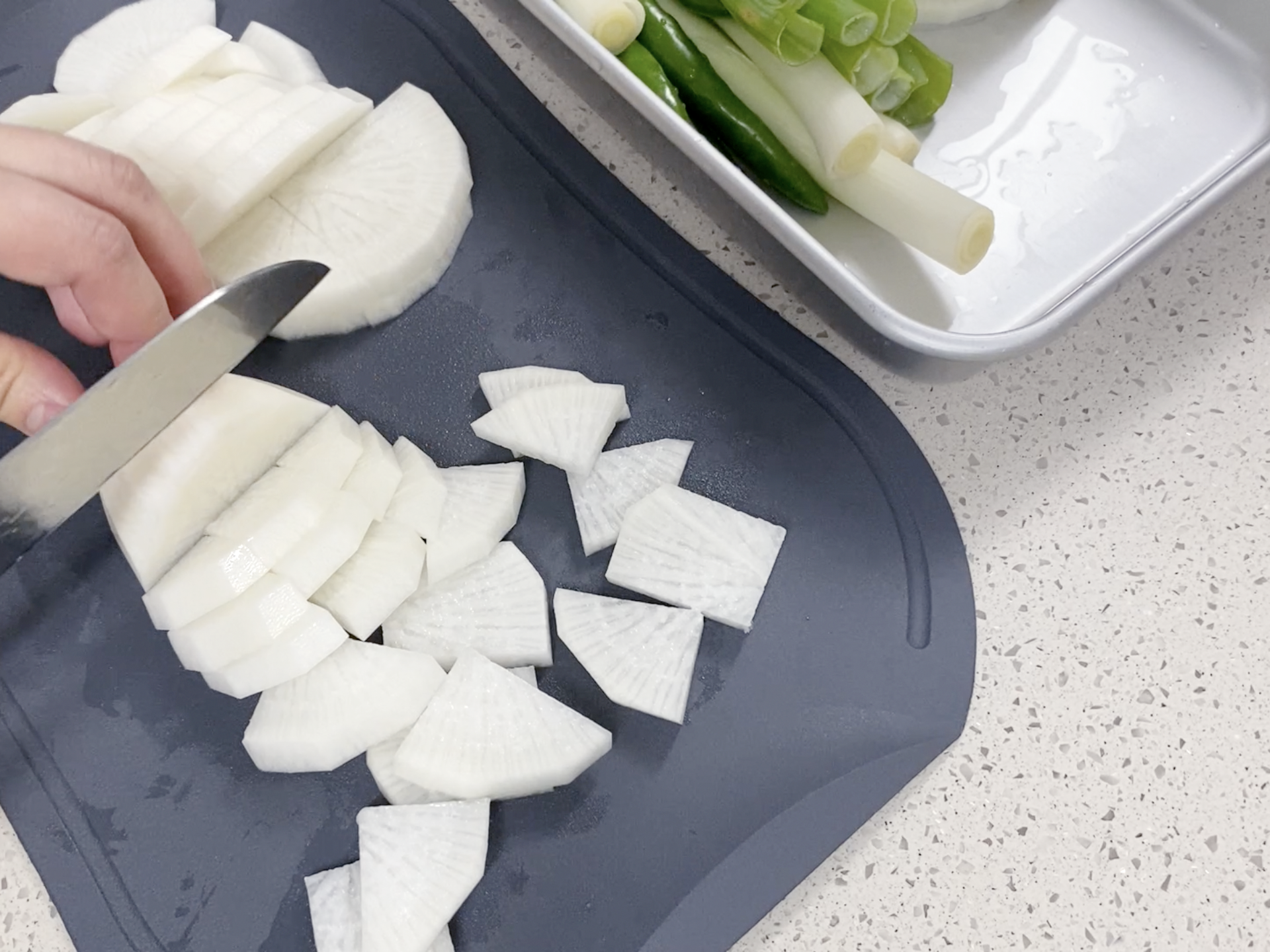 무는 나박 썰고 대파는 길쭉하게 청양고추는 어슷 썰어 주세요. (영상 참조)