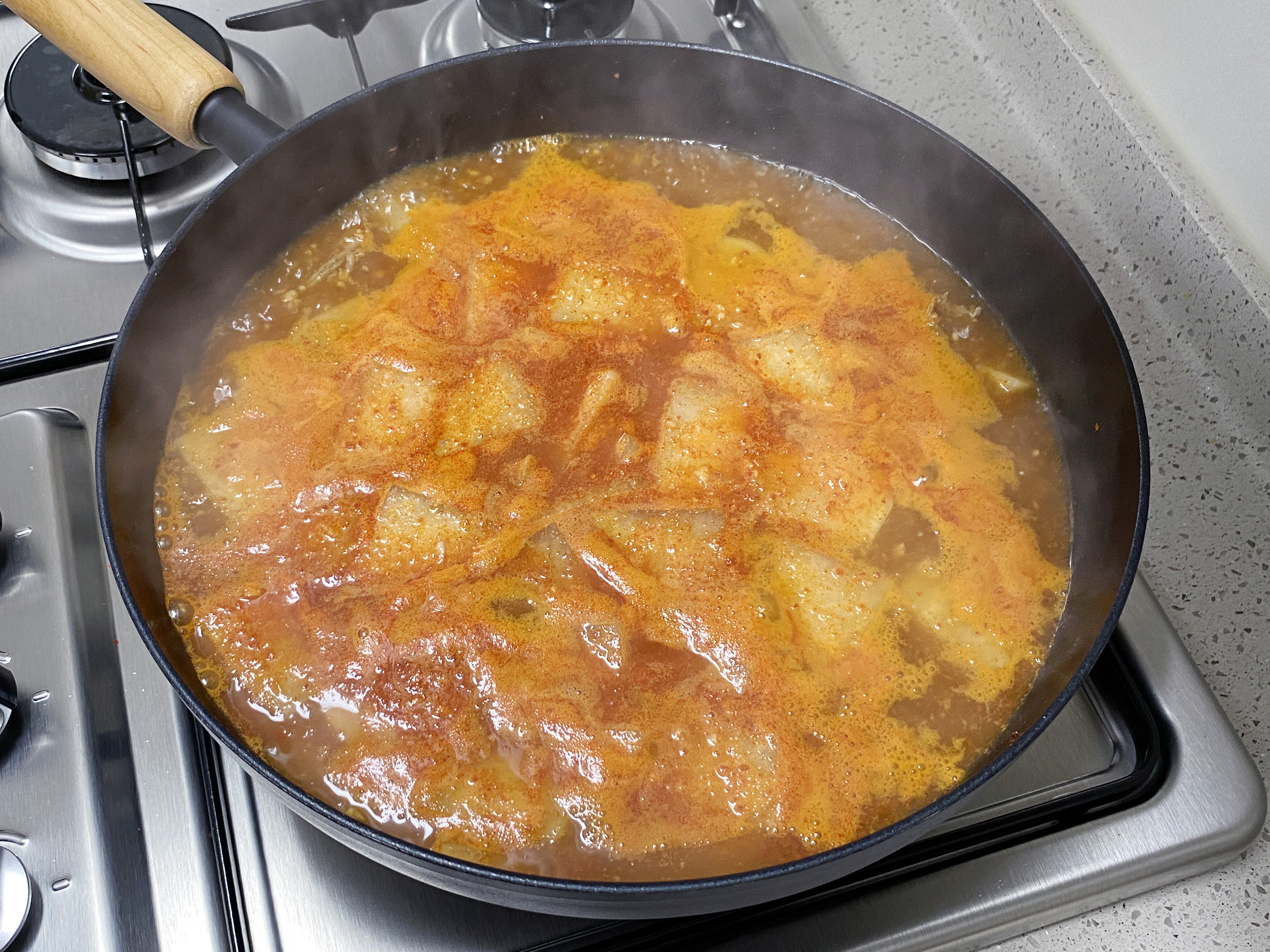 무가 붉게 물들면 물 1.5L(또는 육수)를 붓고 끓여 줍니다.
