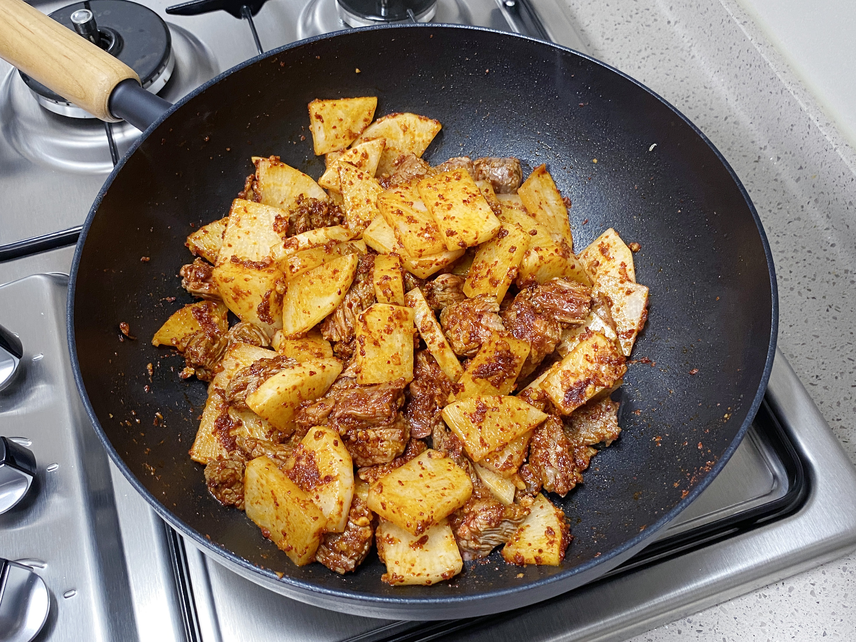 무가 살짝 투명해지면 소고기를 넣고 섞은 다음