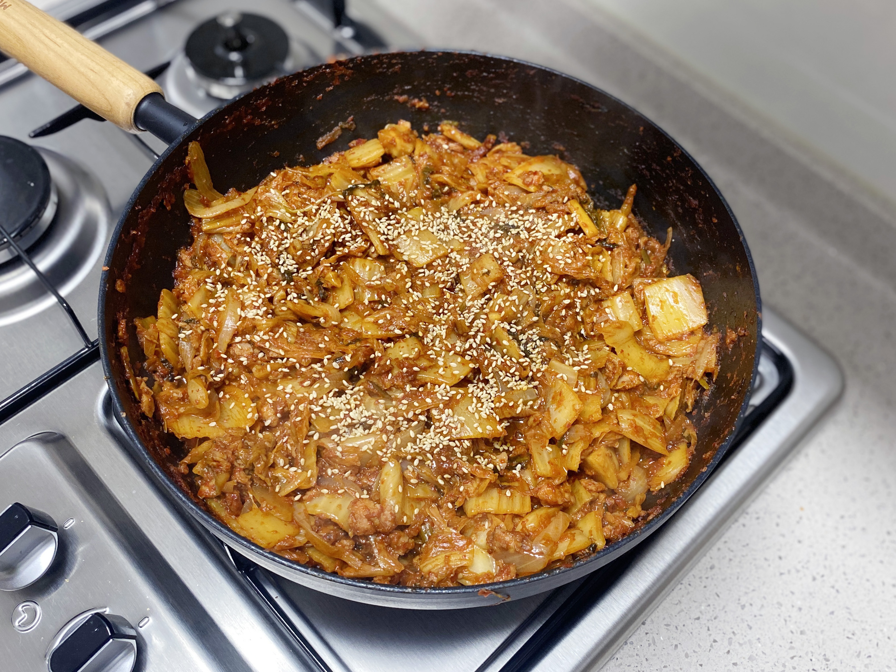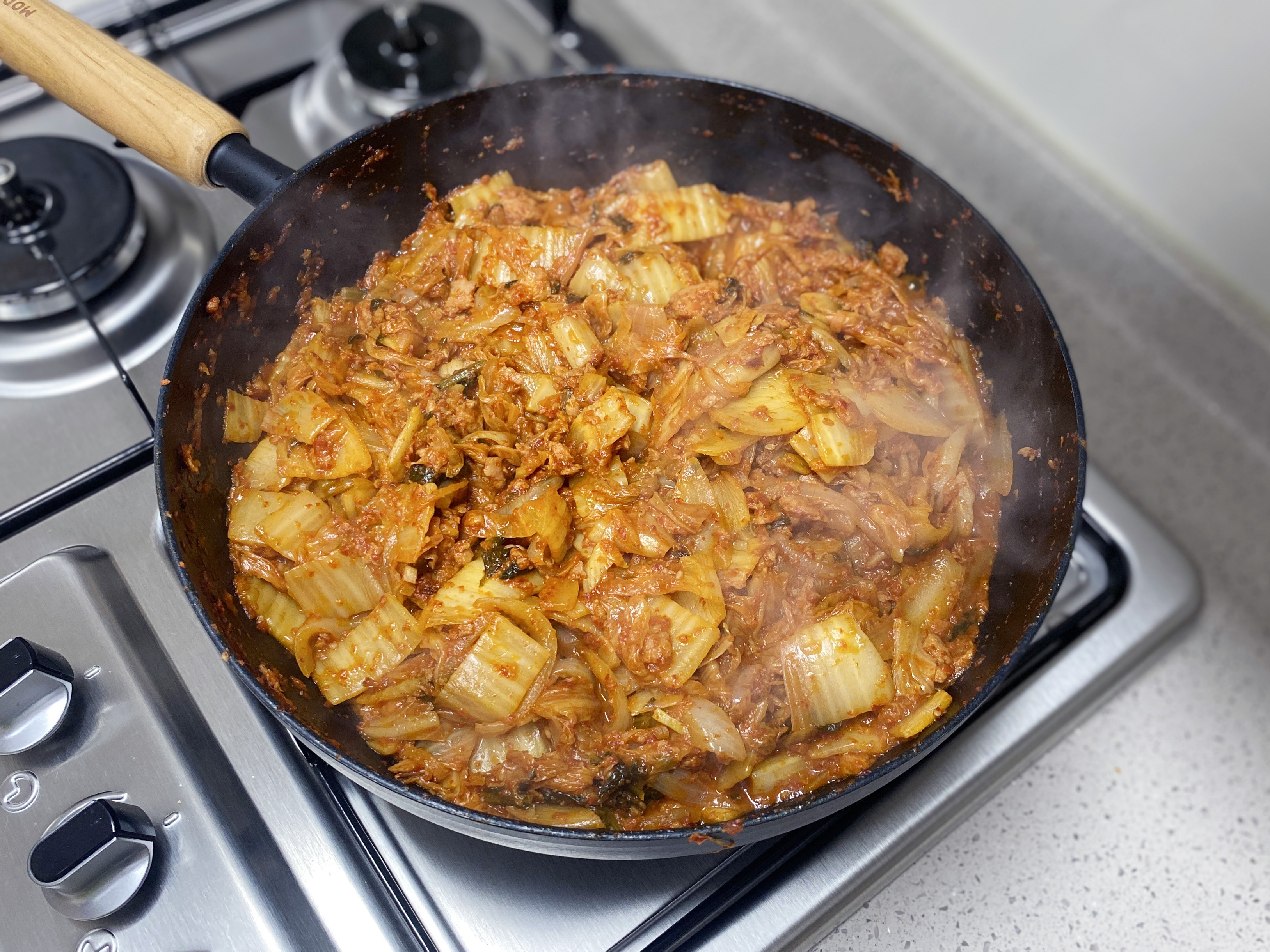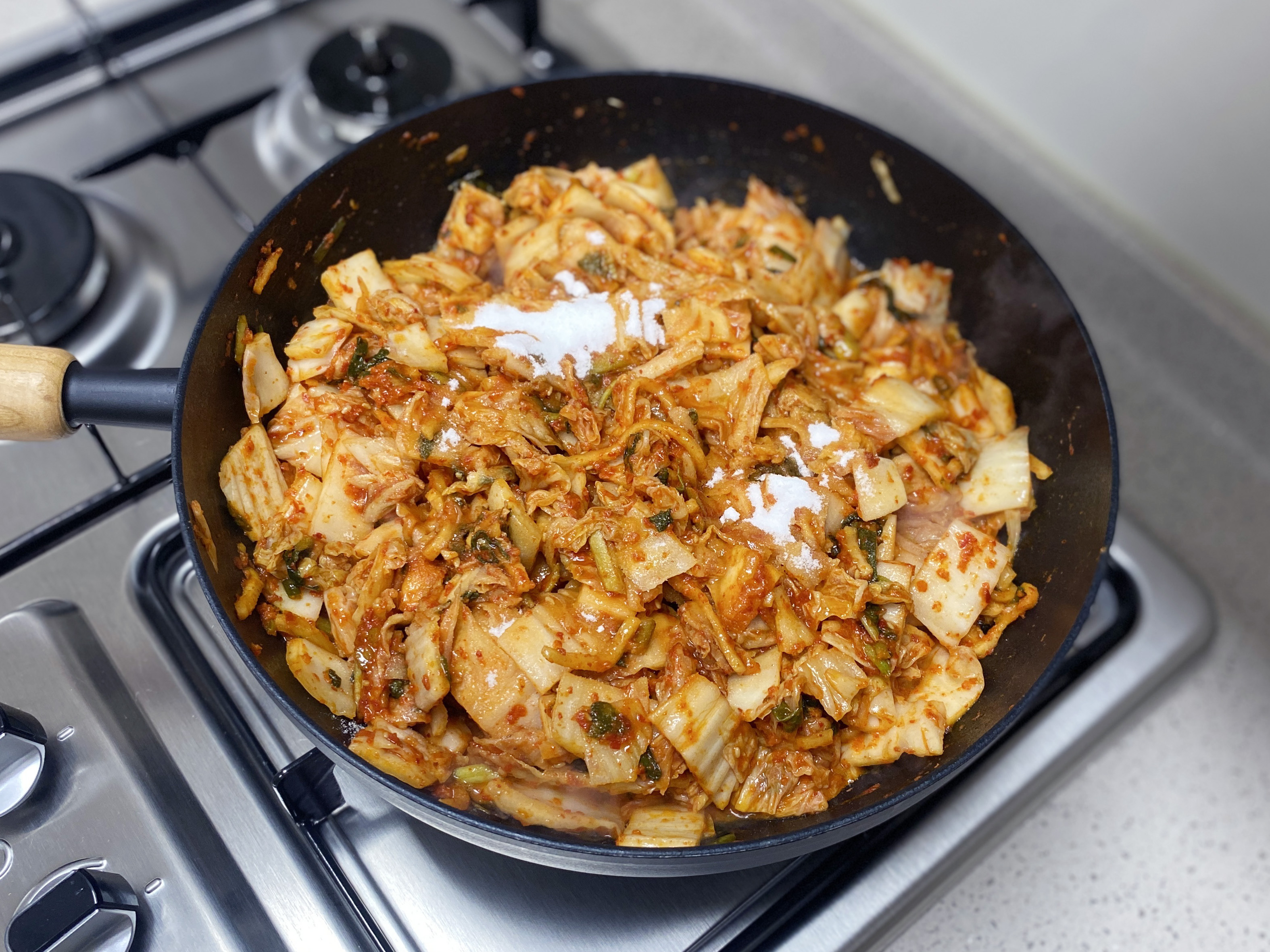 양이 반으로(느낌상..ㅎ) 줄 때까지 충분히 볶아준 다음, (김치가 눋지 않게 잘 섞어가며 볶아 주세요)