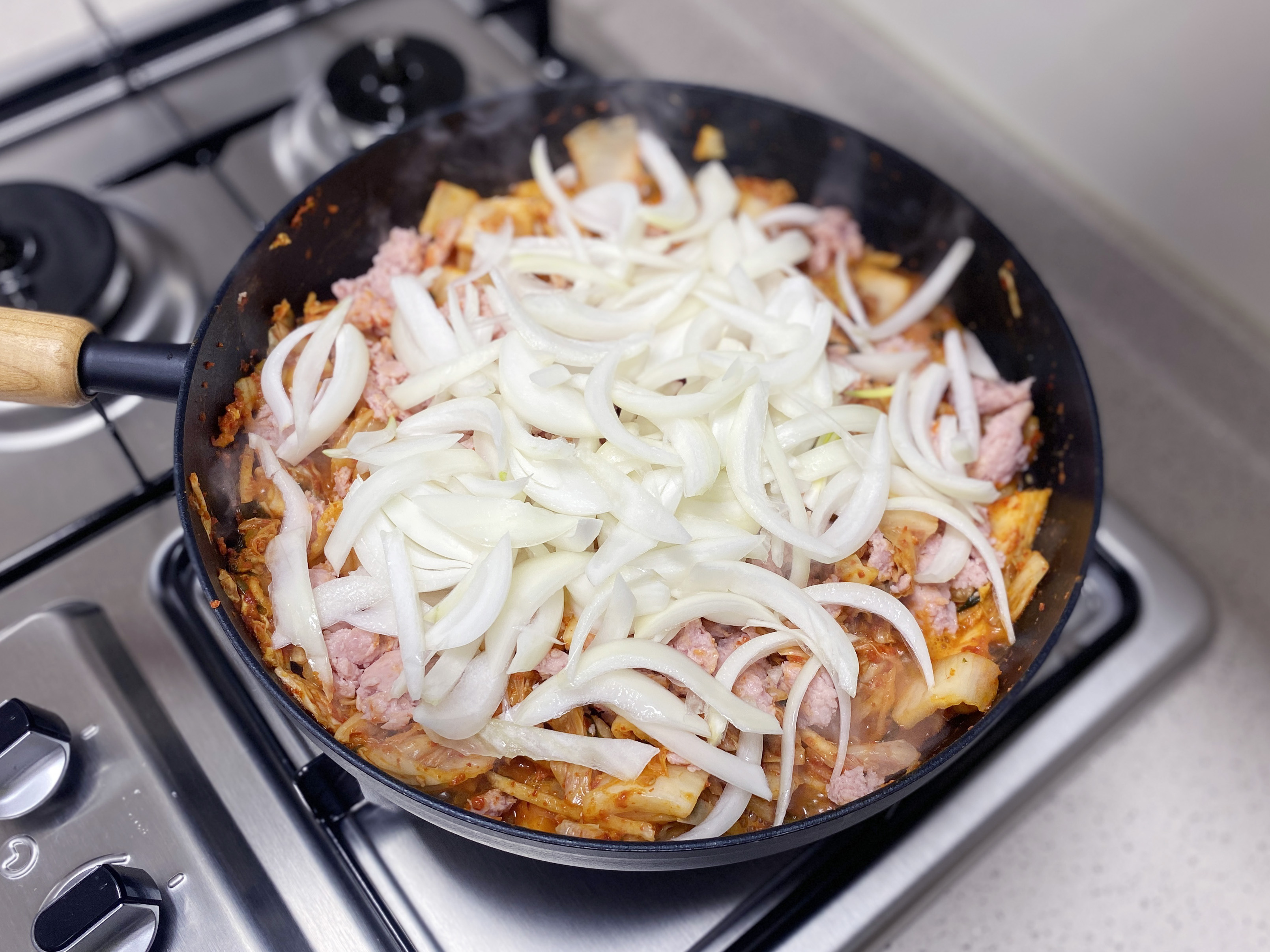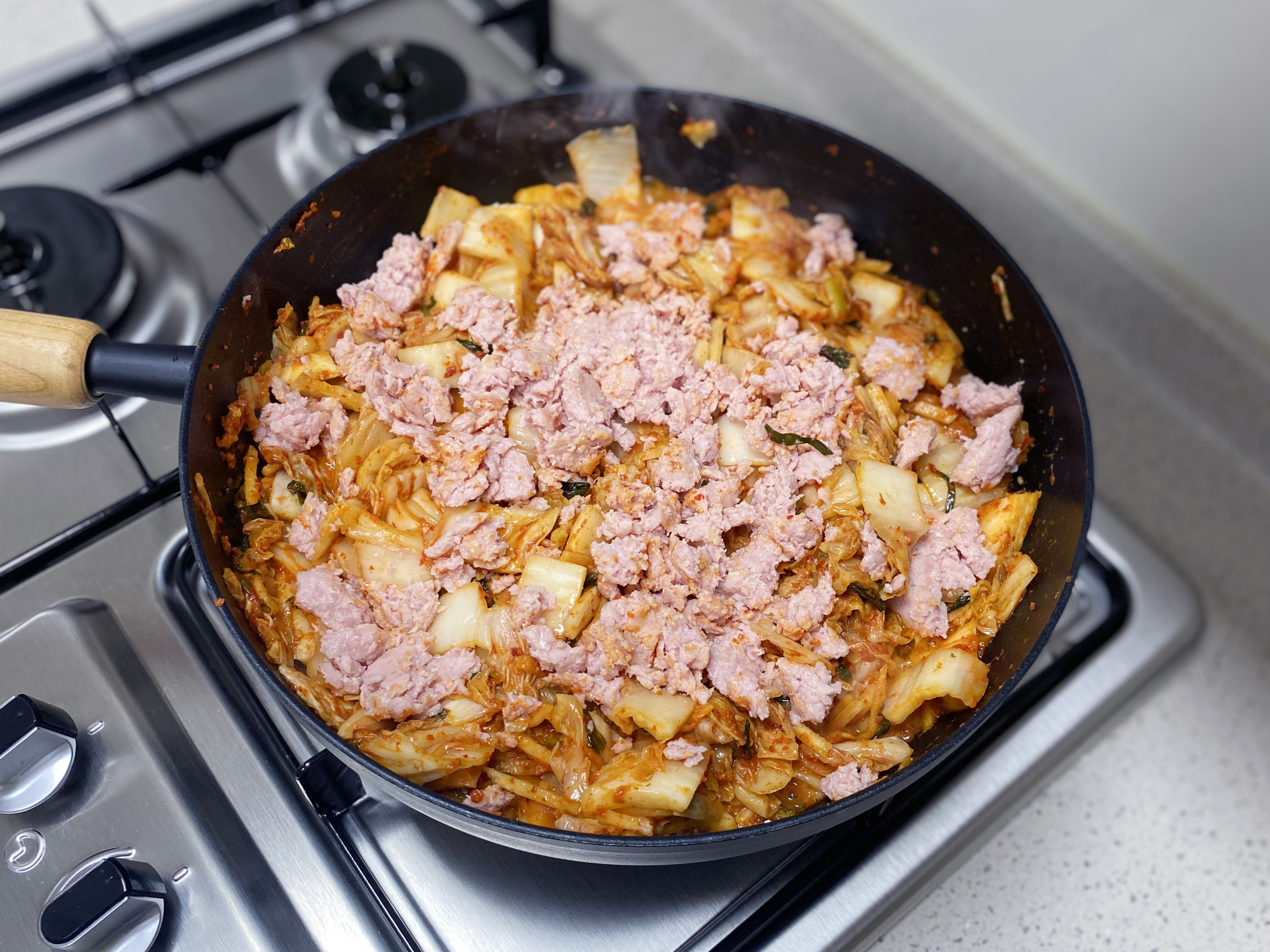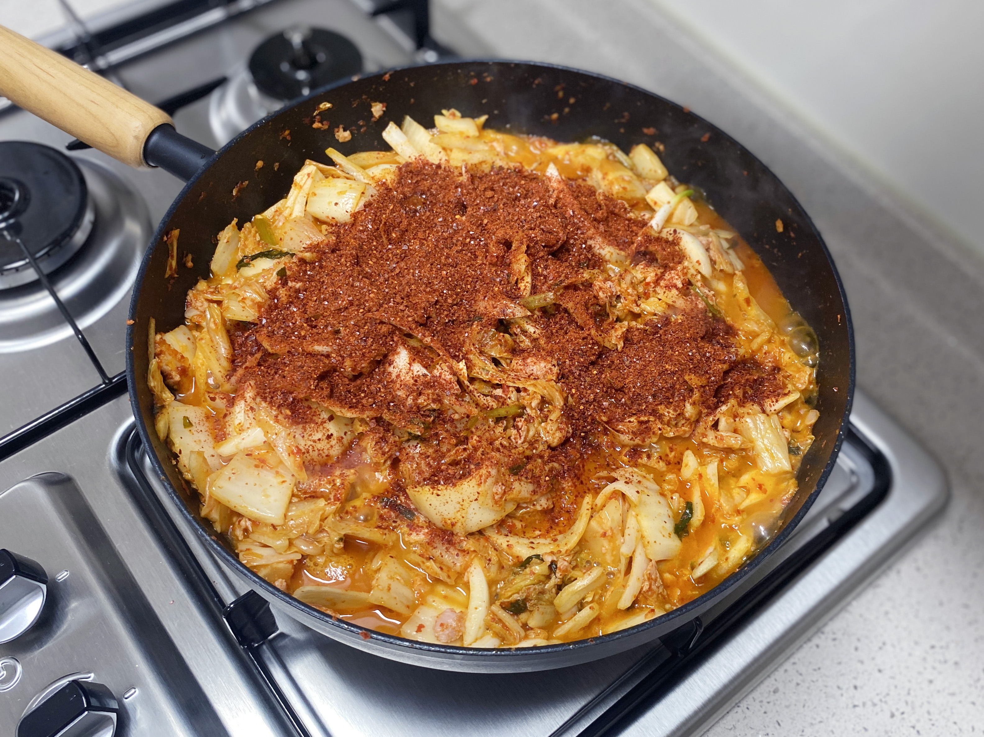 김치의 숨이 살짝 죽으면 으깬 스팸과 채 썰은 양파를 넣고 섞은 다음, 고춧가루 3숟갈 그리고 물 1컵을 붓고 조리듯 볶아 주세요 (고춧가루는 빼셔도 돼요)