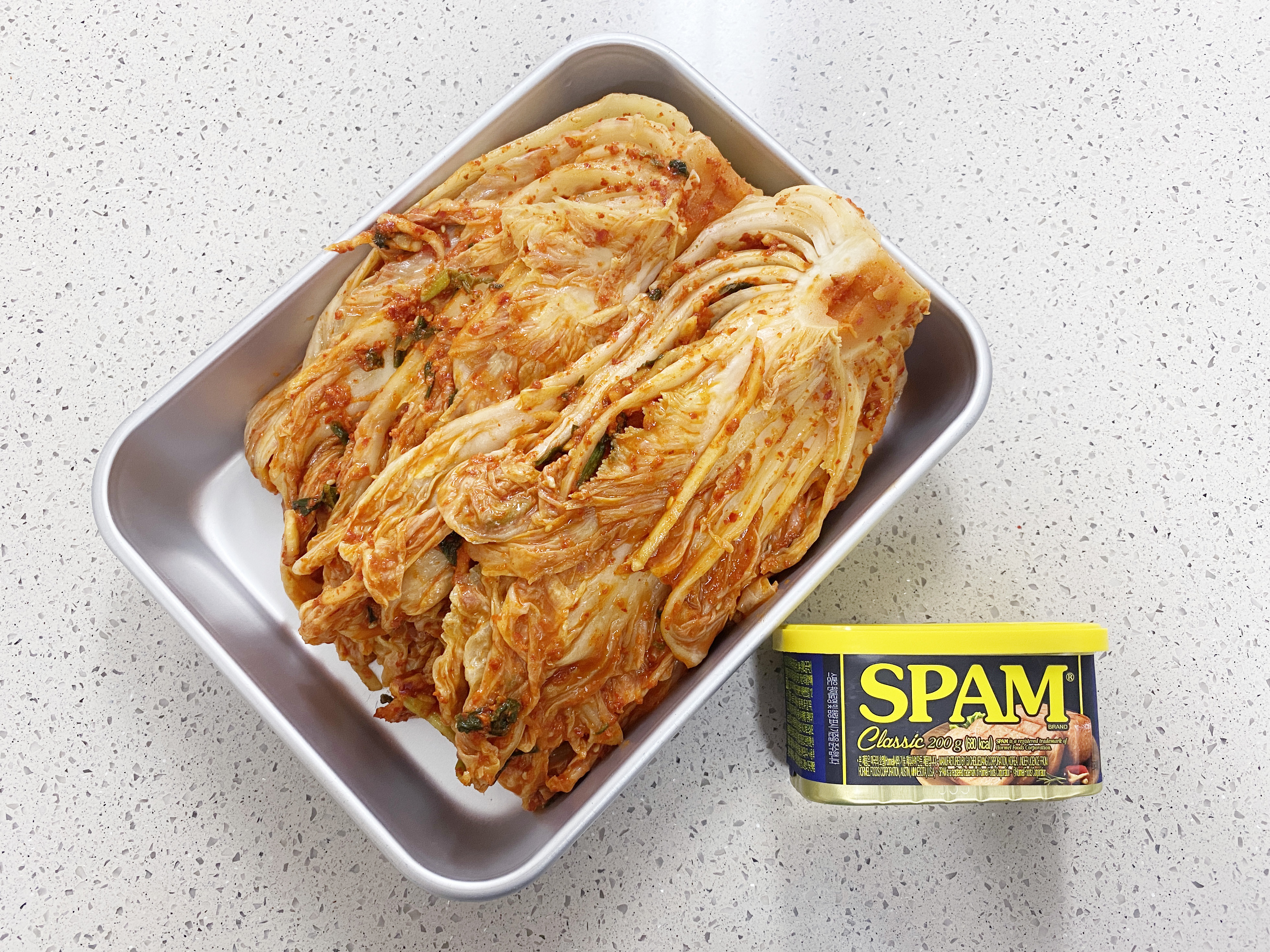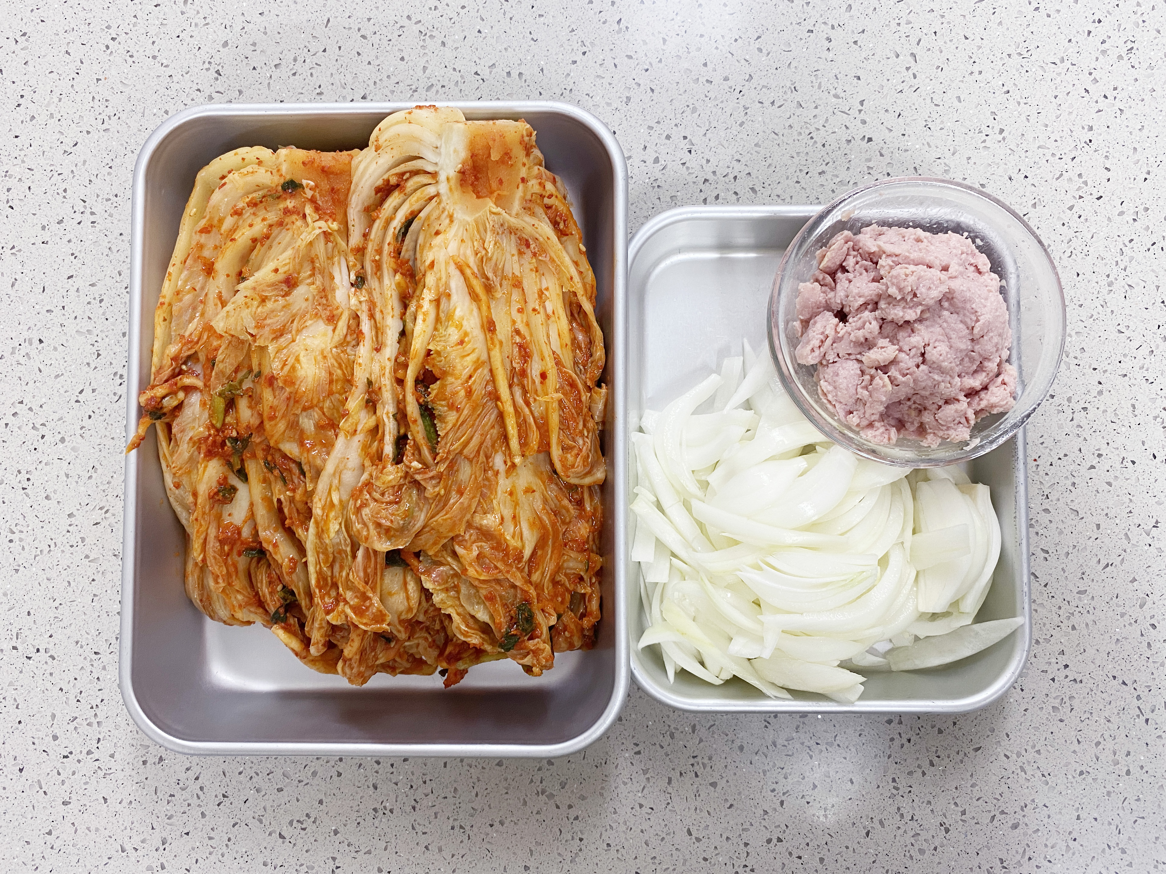 김치는 볶음용이니 잘게 썰고 양파는 채썰기, 스팸은 위생봉투에 넣고 으깨 주세요 (영상 참조)