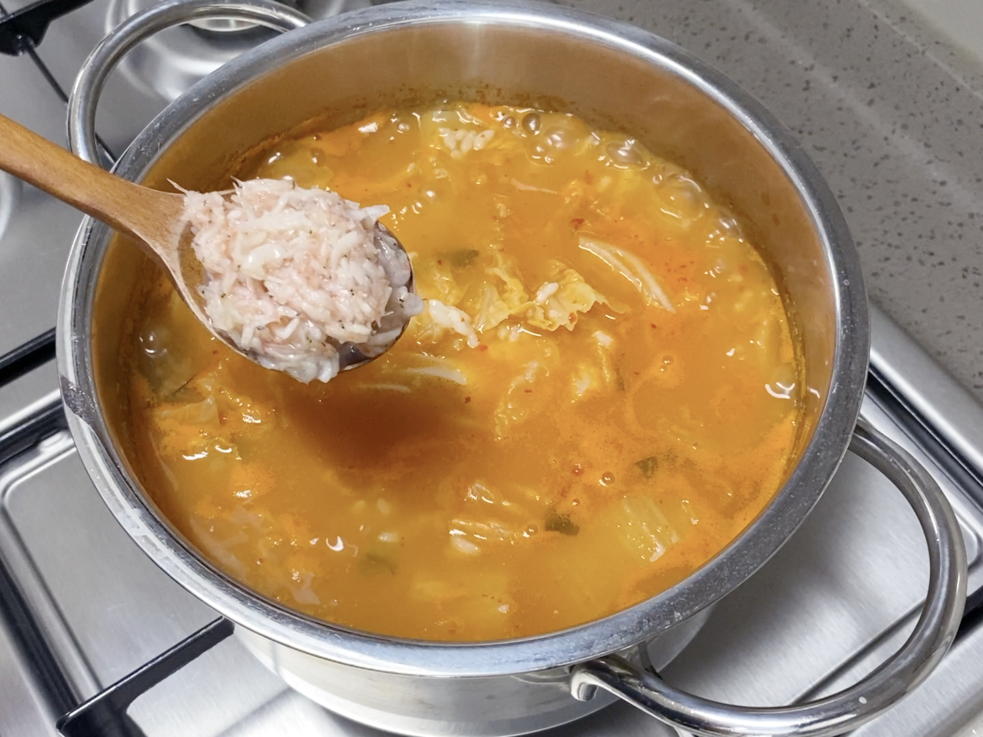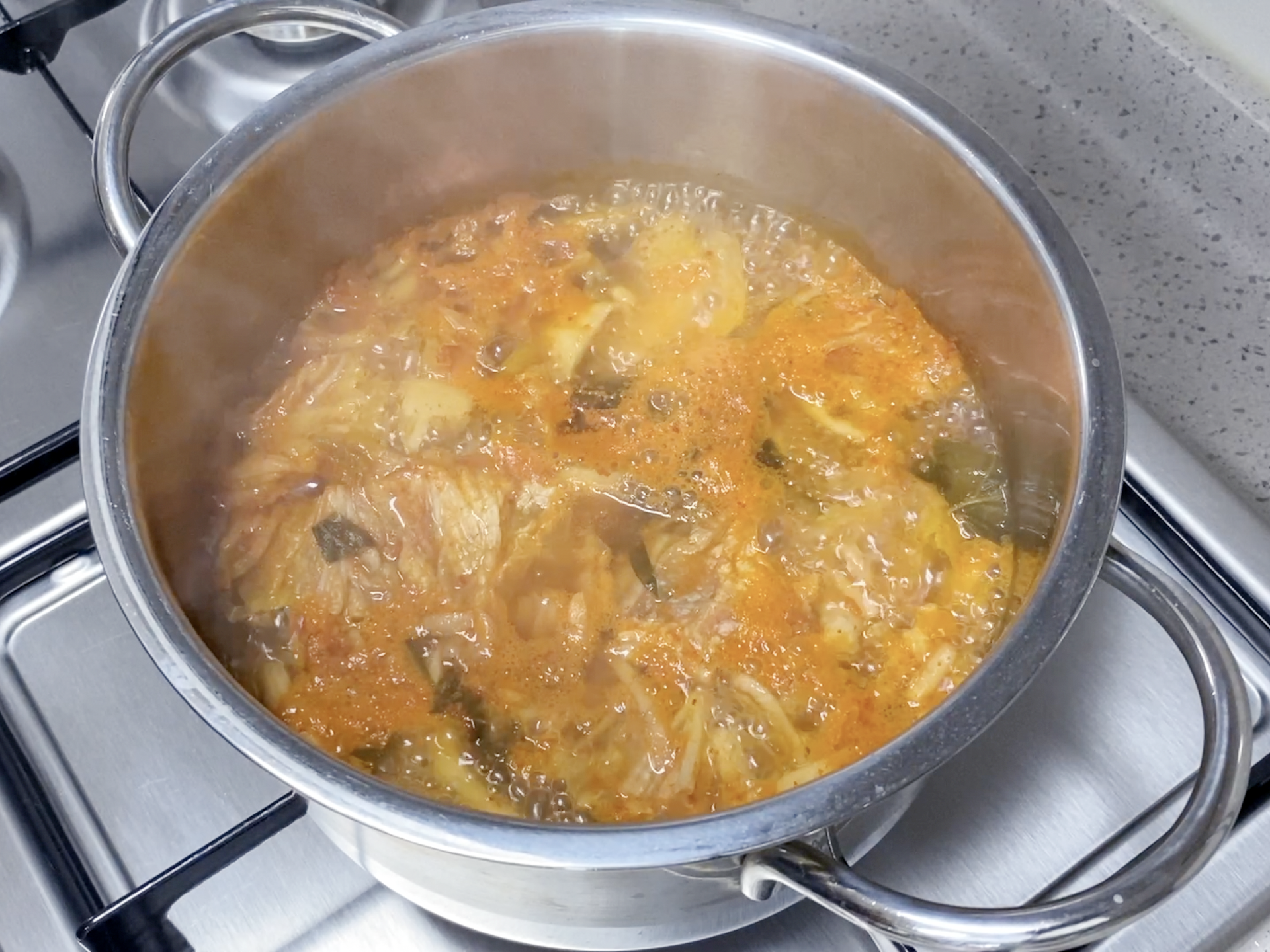 육수가 끓여지면 김치만 넣고 푹 끓입니다