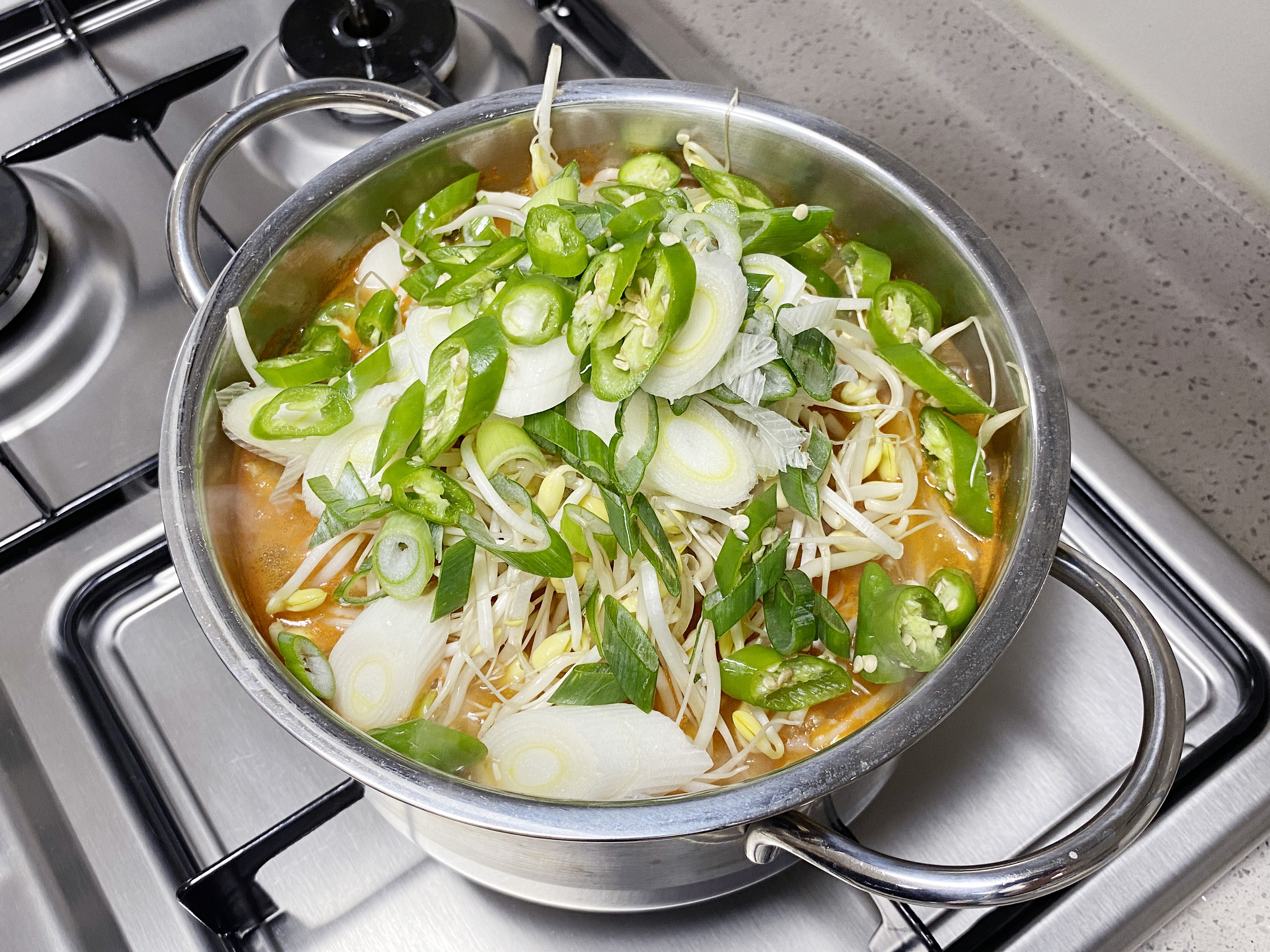 밥알이 부드럽게 퍼지면 콩나물과 대파, 청양고추를 넣고 끓여주면 완성..!!인데 보기에도 넘칠 것 같죠.. 간도 살짝 부족해서 참치액 1숟갈을 추가해 주었네요. (참치액은 드셔 보시고 취향껏 넣어 주세요!!)