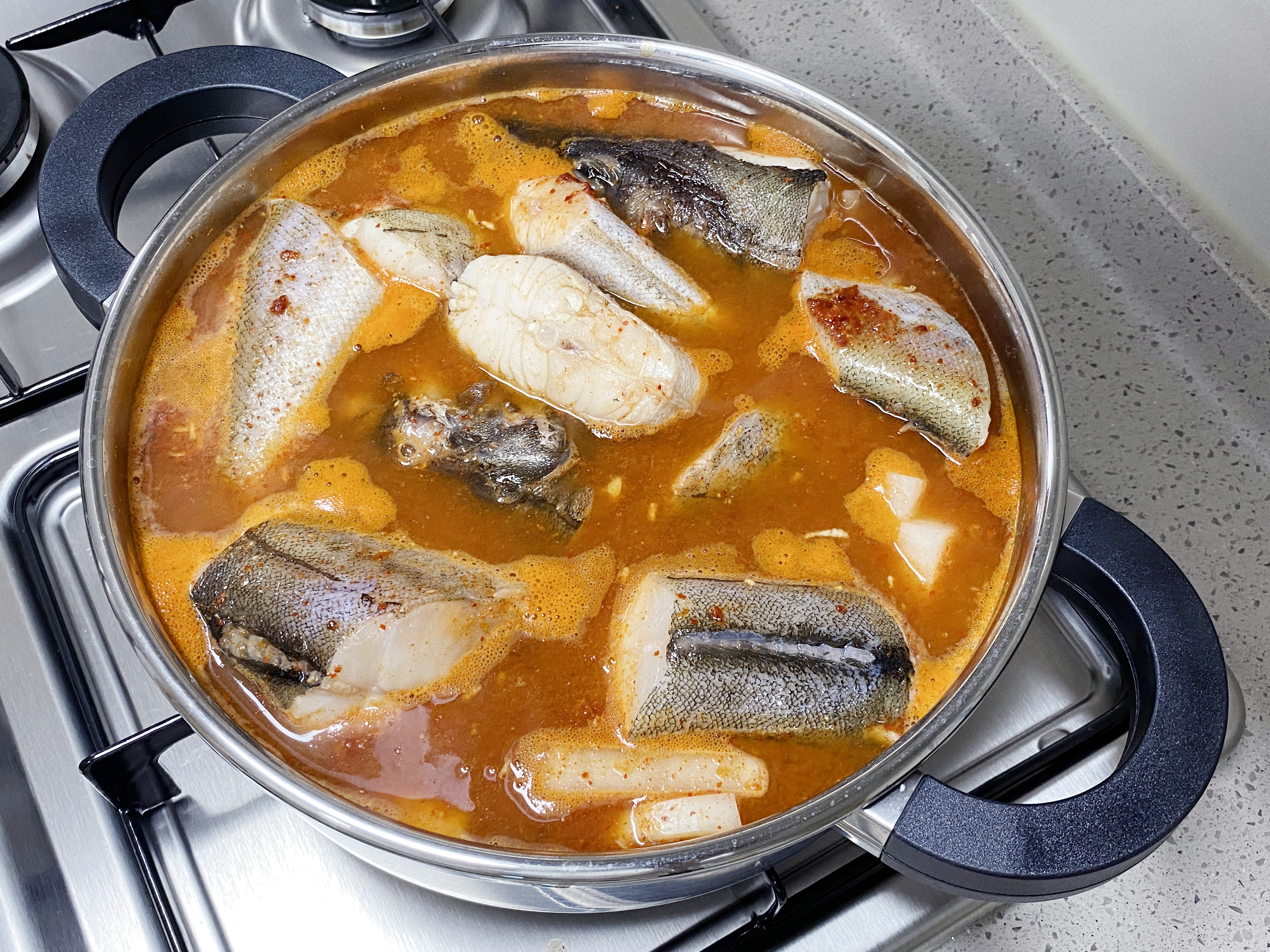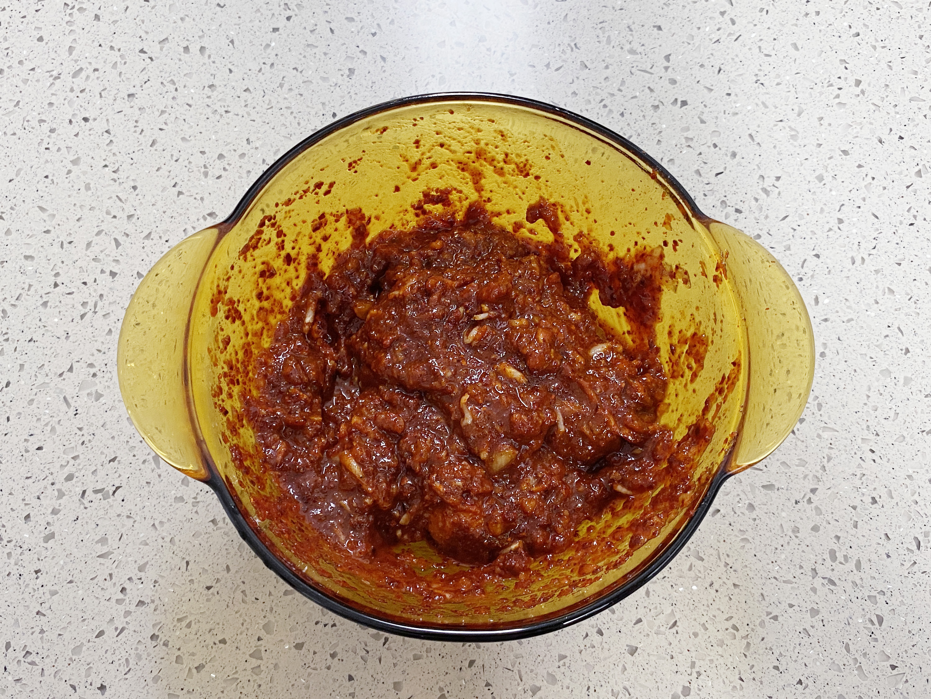 끓이는 동안 분량의 양념장 (고춧가루 3숟갈, 고추장 2숟갈, 국간장 2숟갈, 맛술 2숟갈, 새우젓 1숟갈, 된장 1숟갈, 간 마늘 1숟갈, 다진 생강 1티스푼)을 만들어 주세요