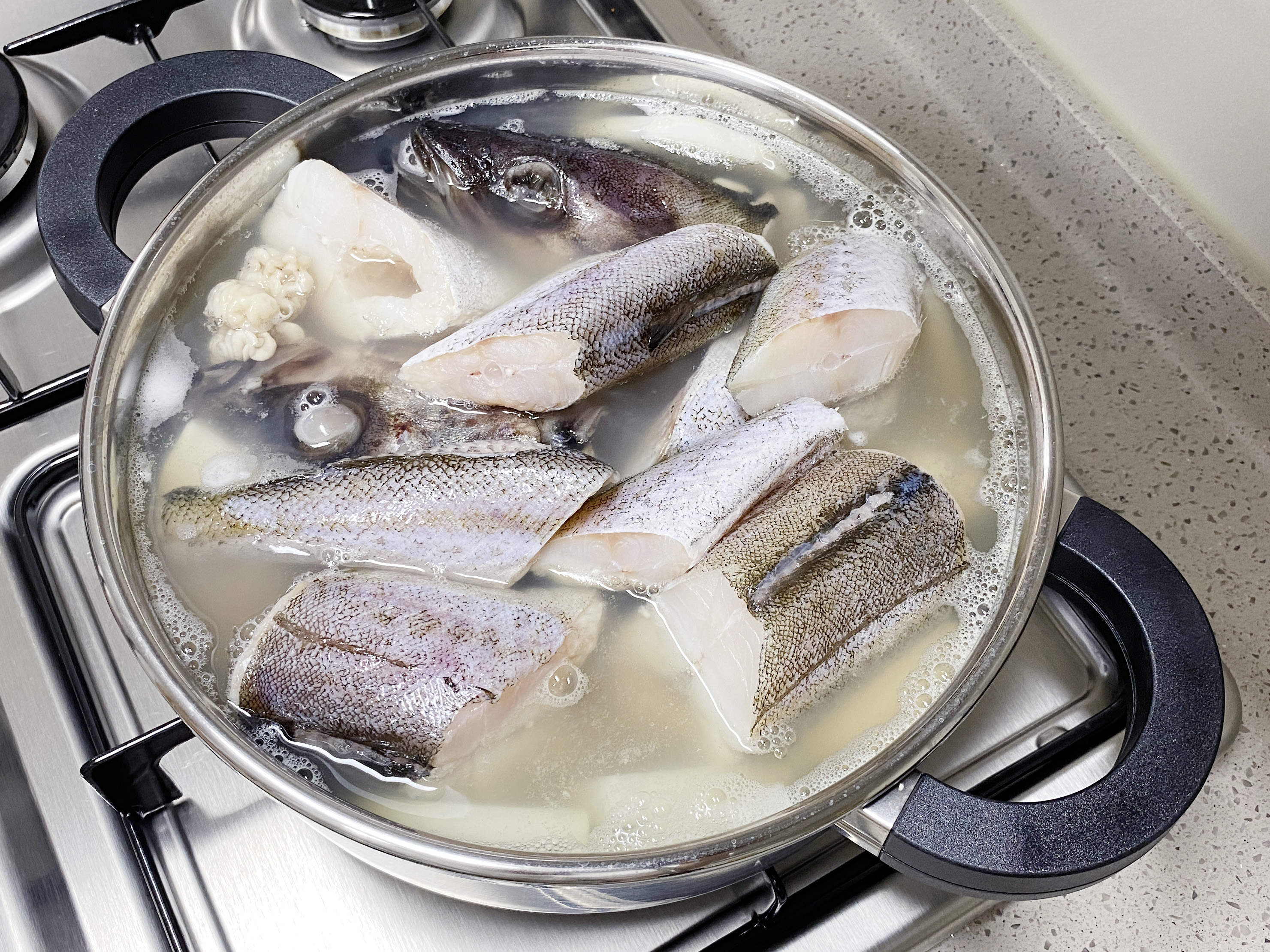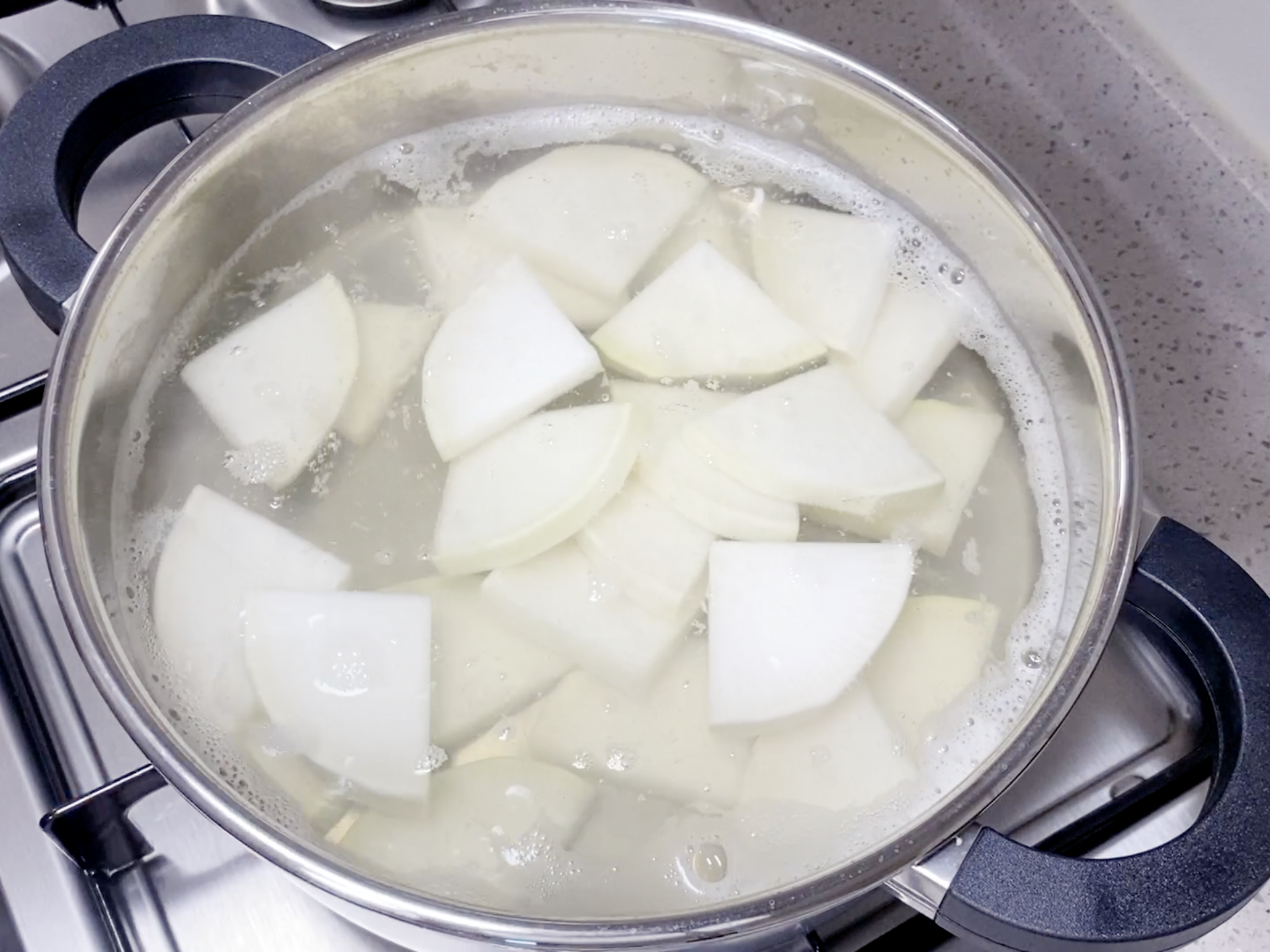 멸치육수를 낸 다음 무만 넣고 끓여 줍니다.
