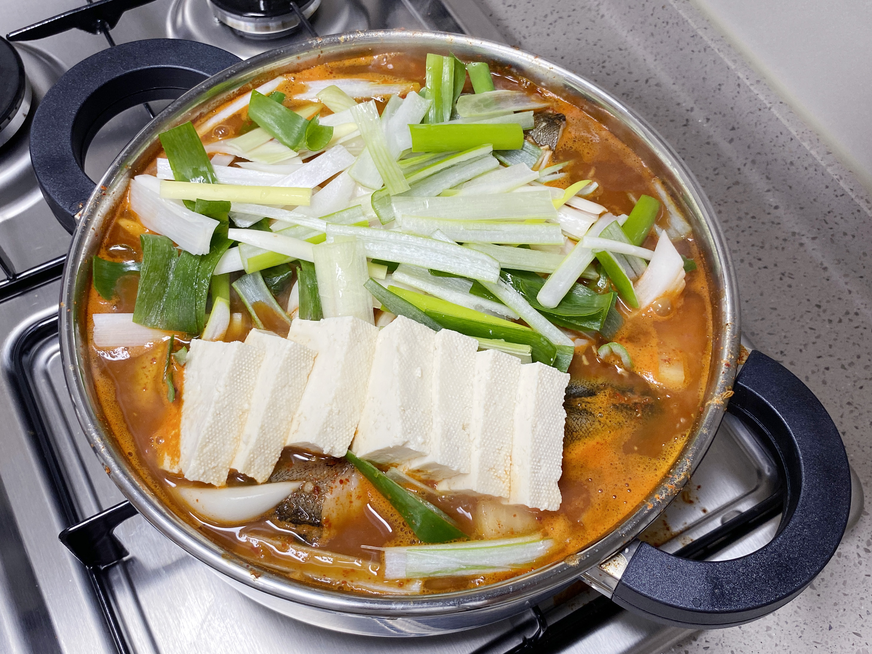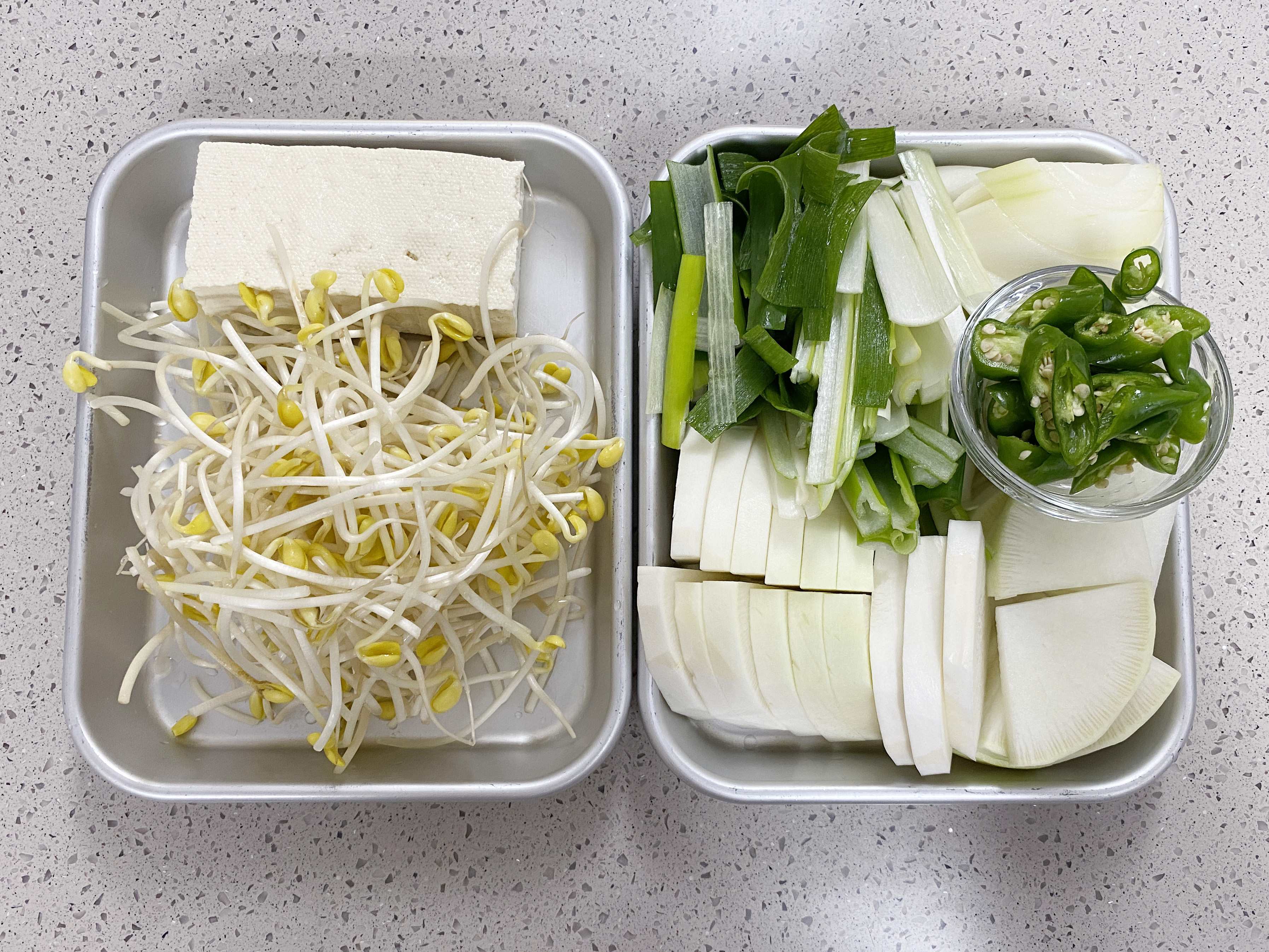 무와 양파는 도톰하게 썰고 청양고추는 어슷하게 대파도 길쭉하게 썰어 주세요 두부도요~