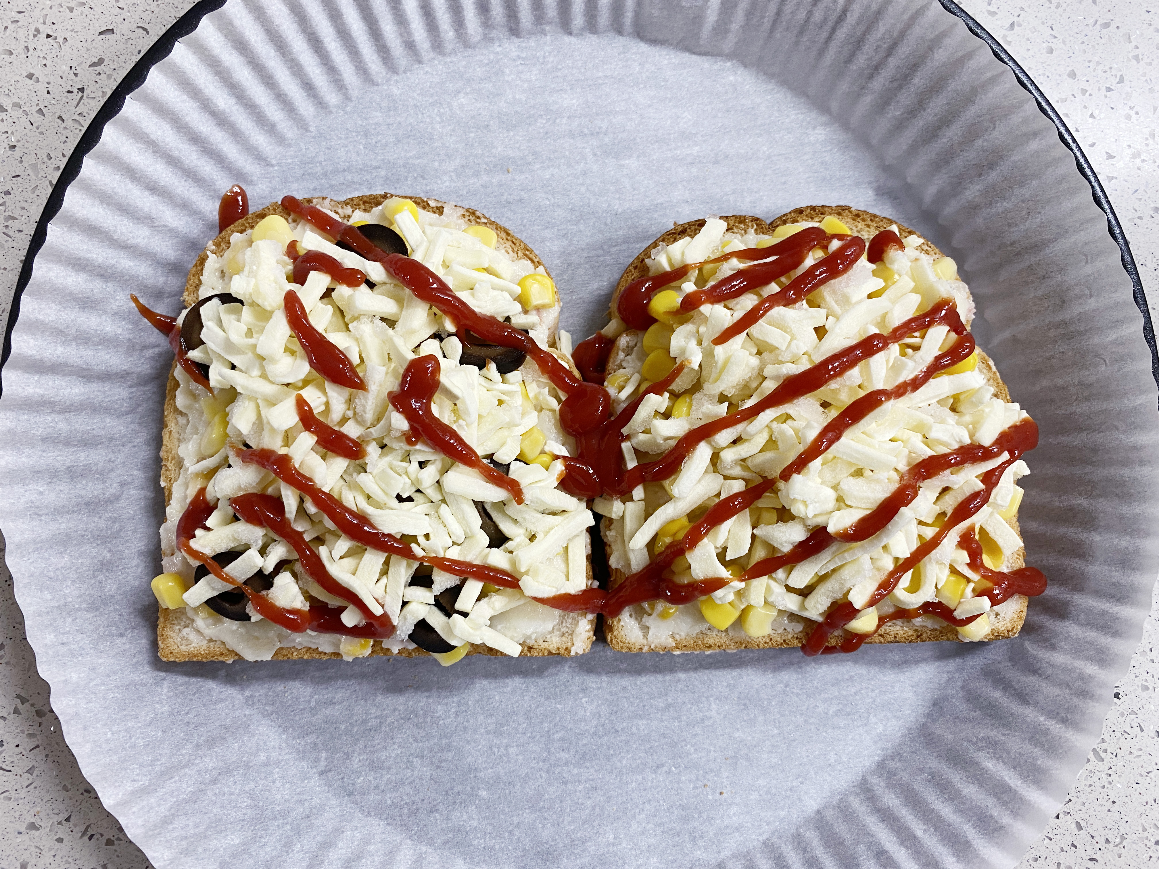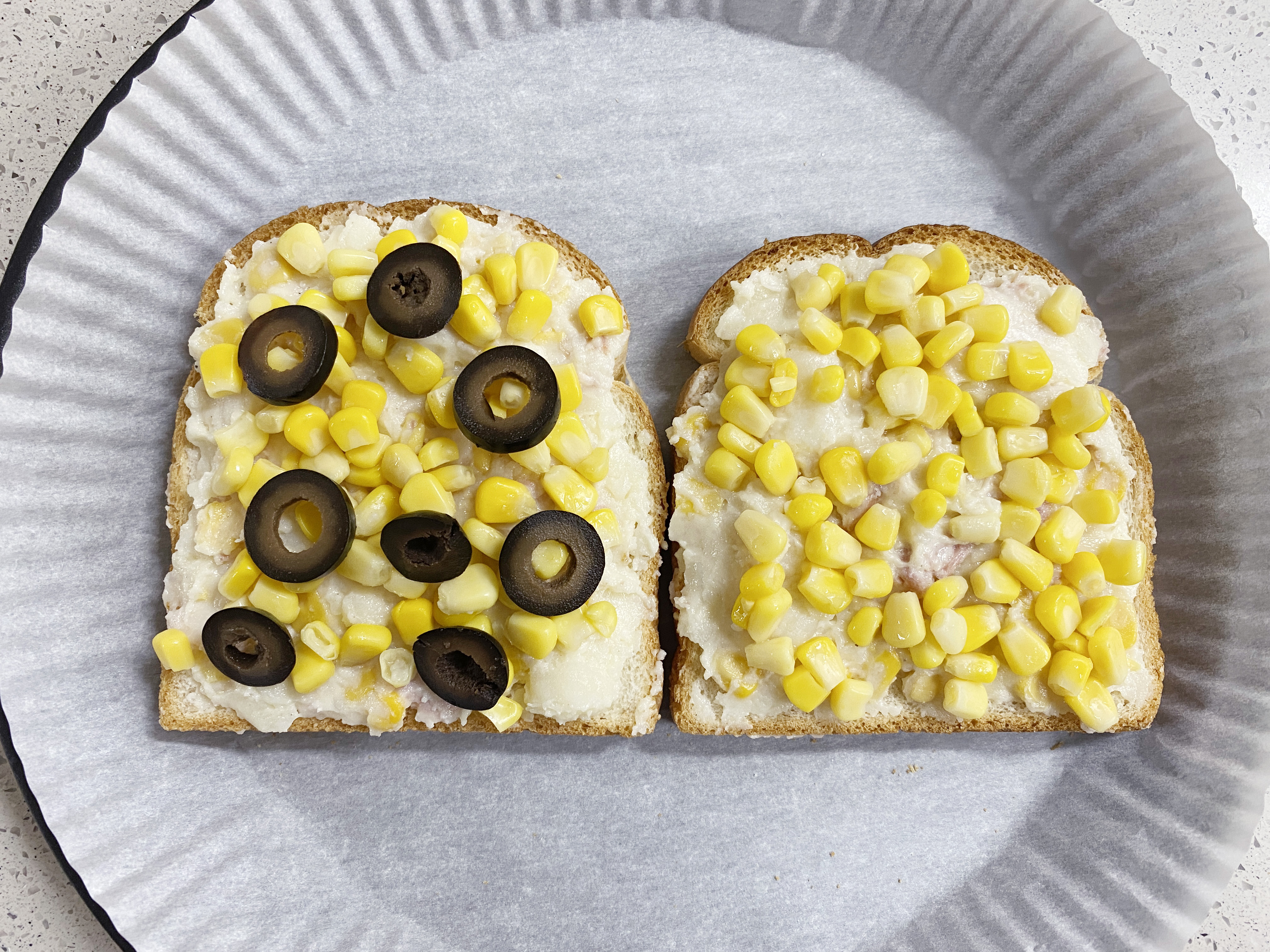 옥수수콘과 블랙 올리브를 올려 주었어요