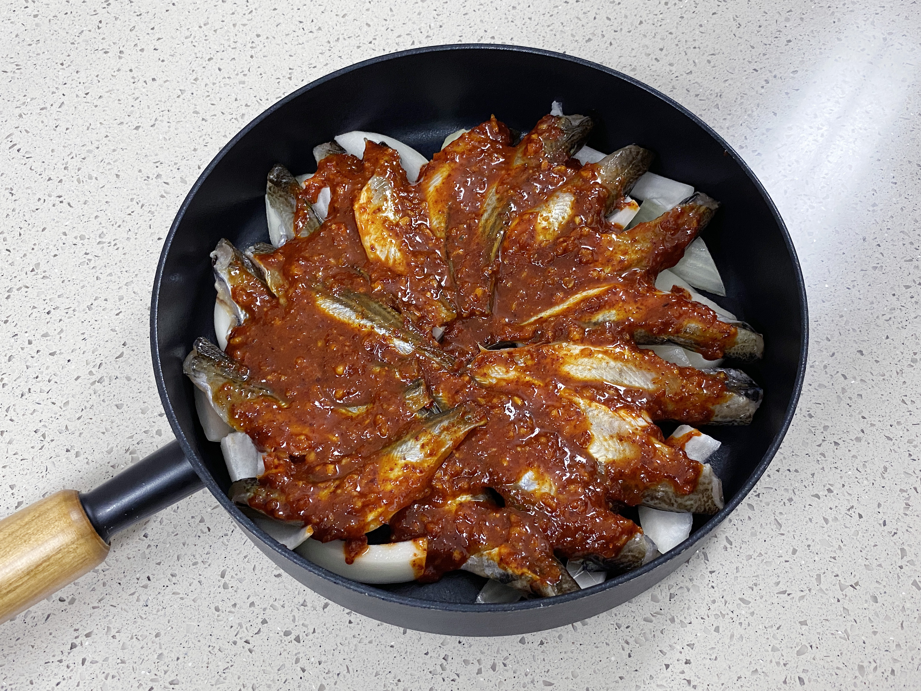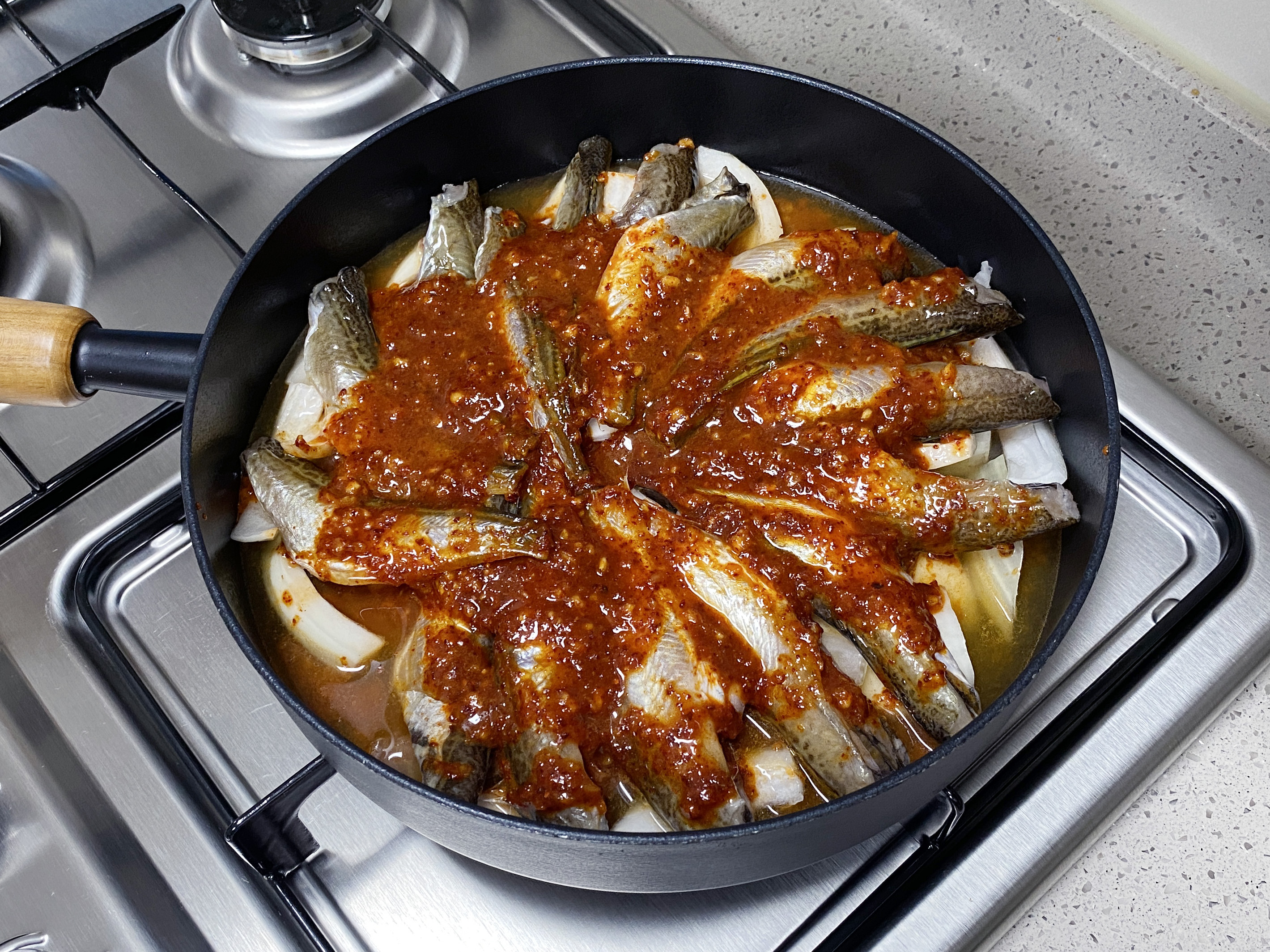 분량의 양념장을 만들어 도루묵에 올려 주세요