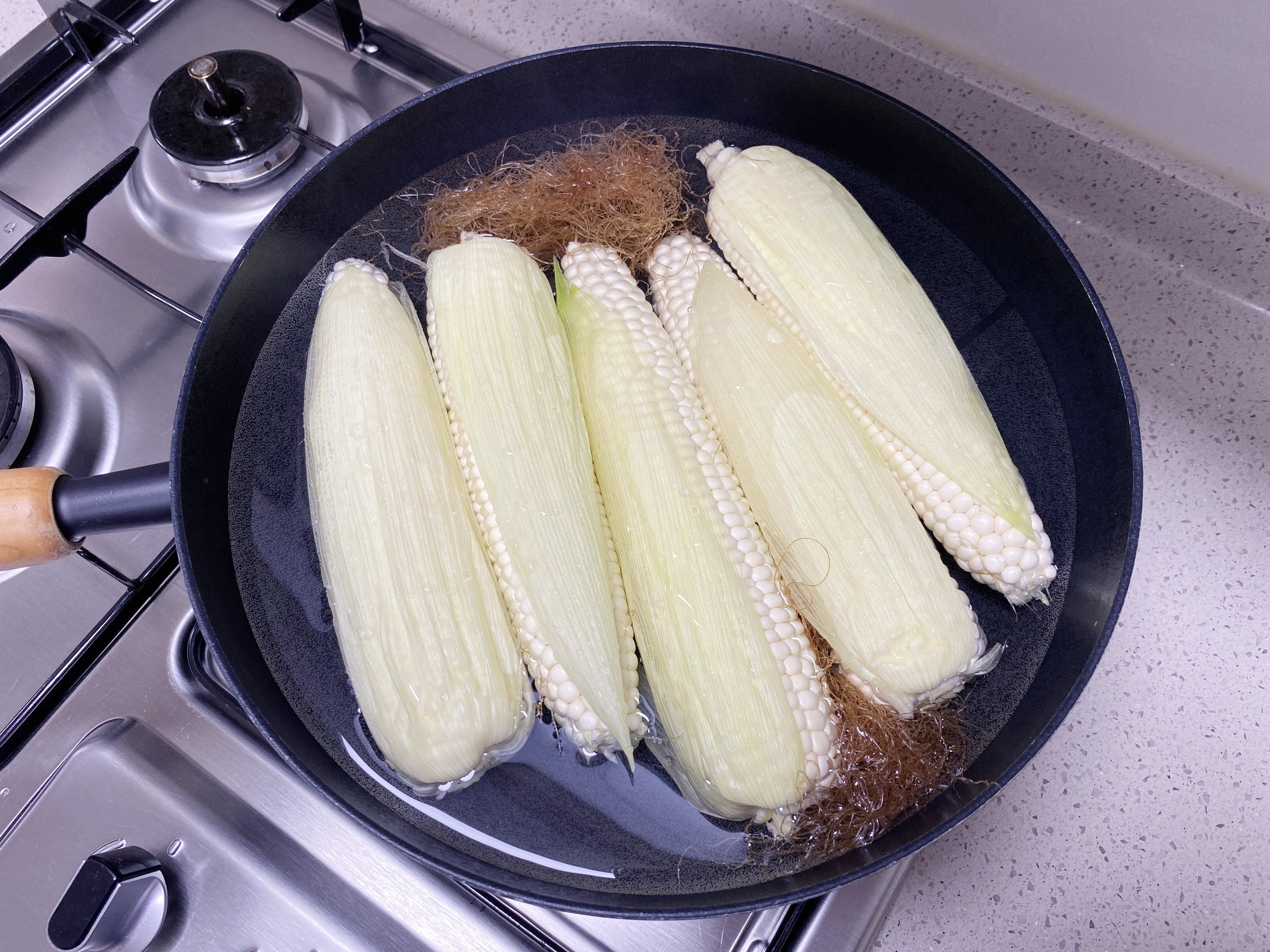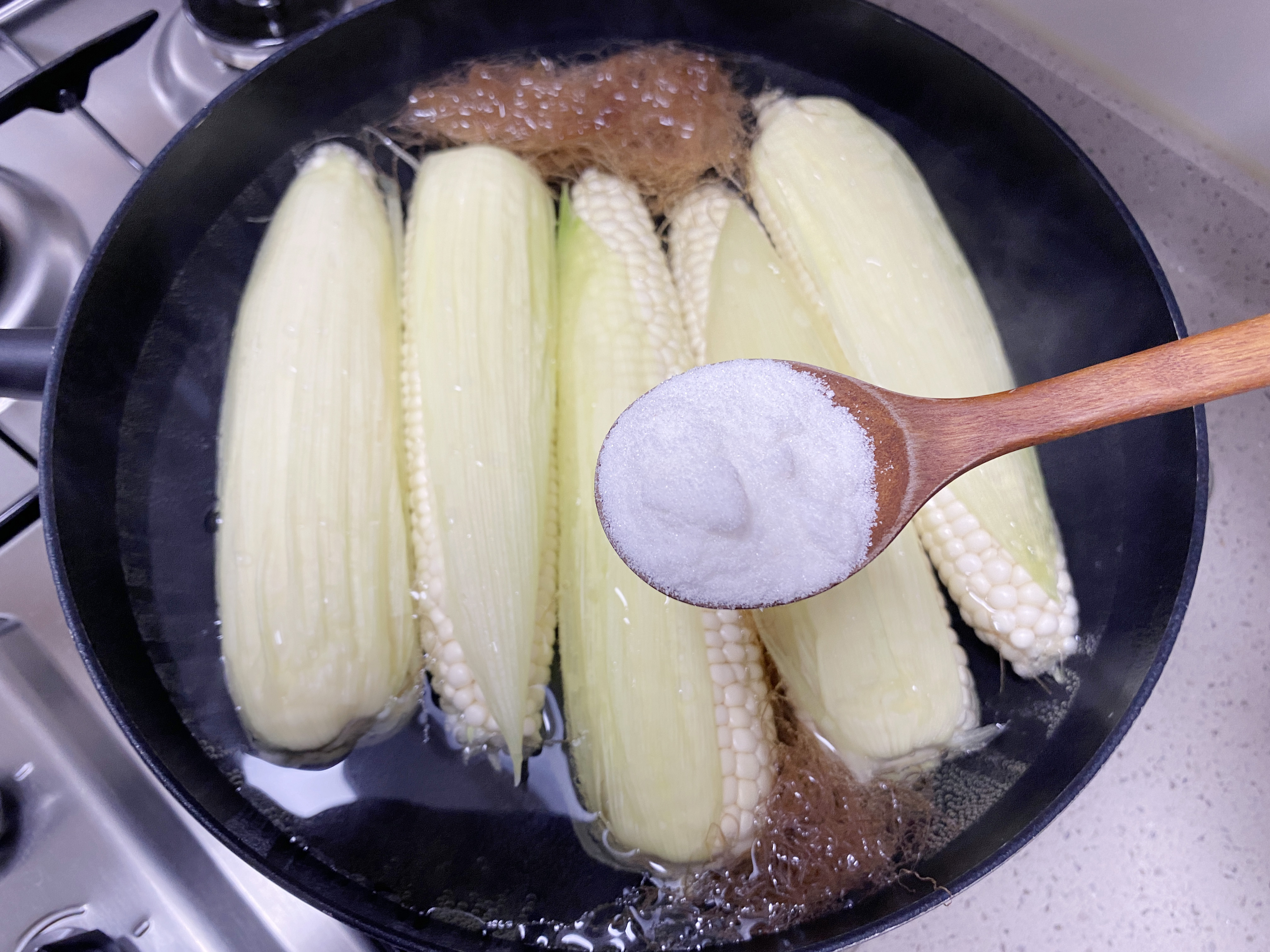 냄비에 옥수수와 수염을 넣고