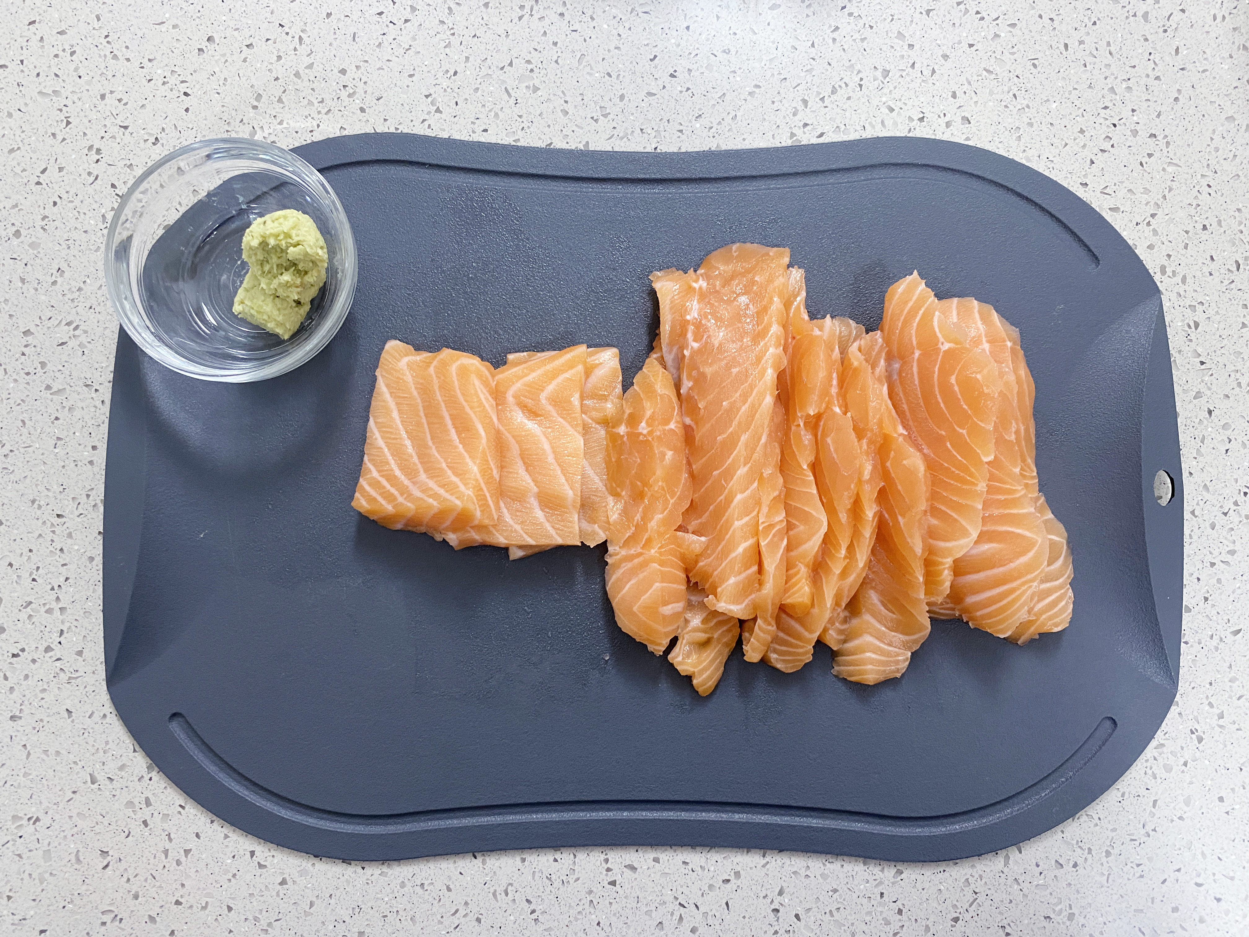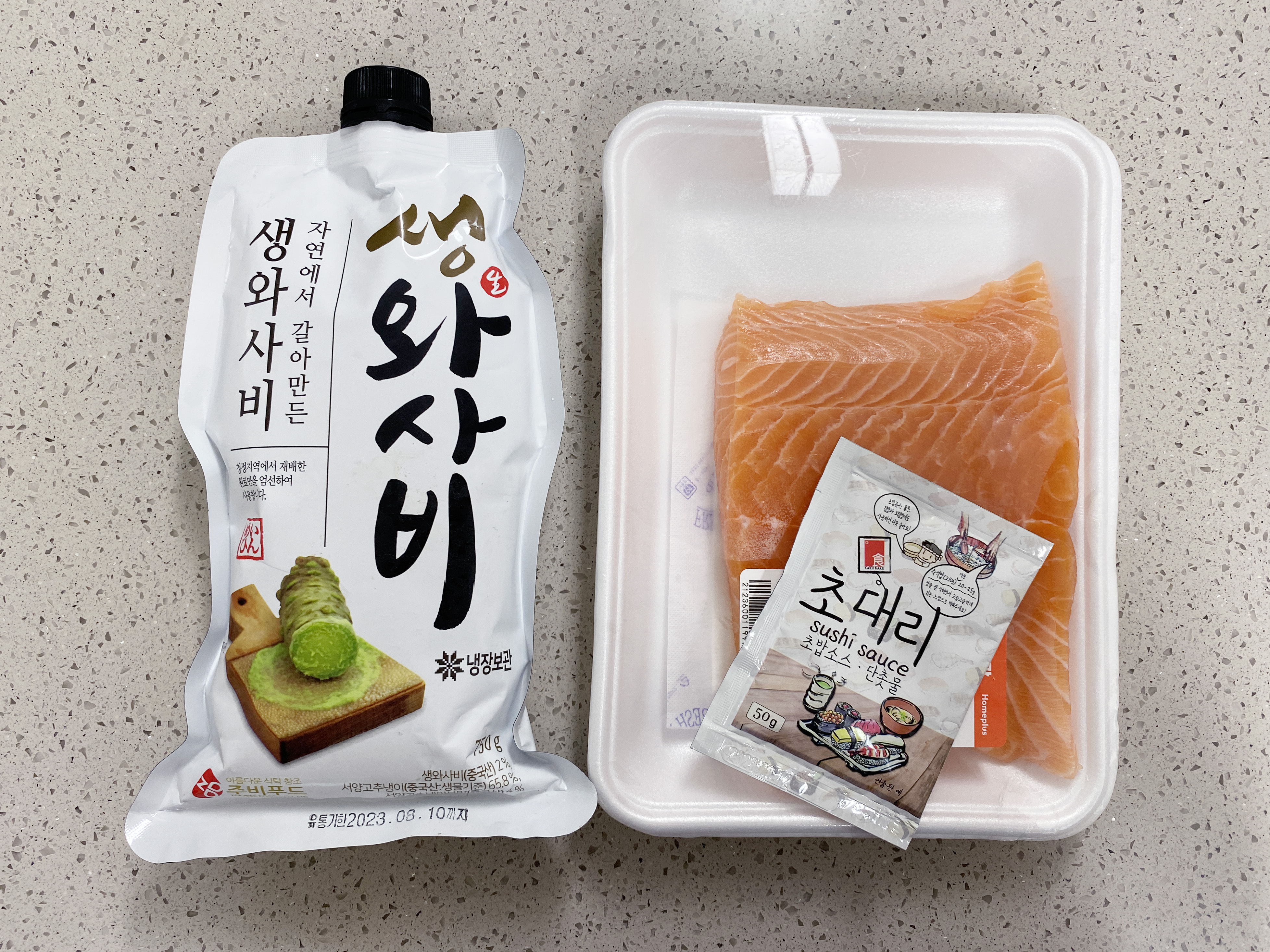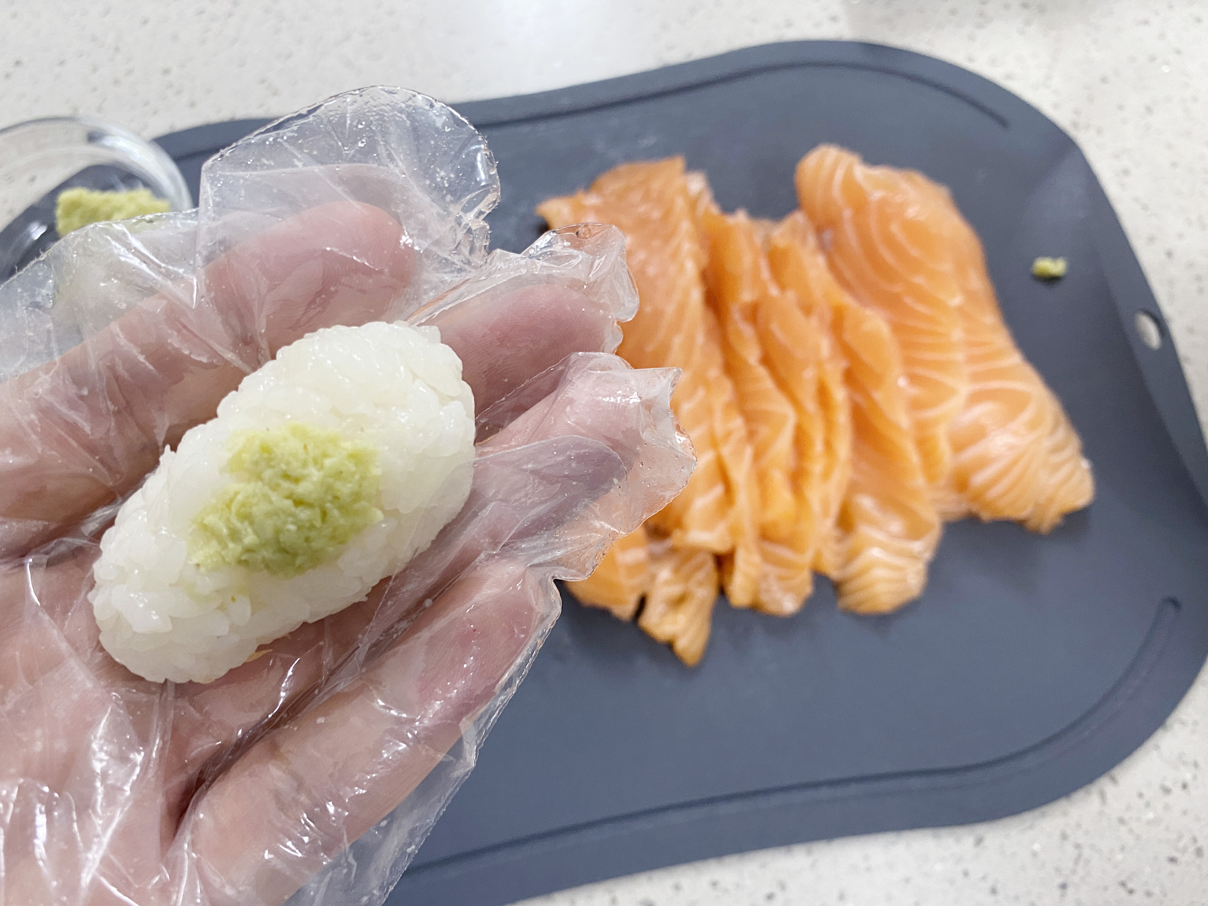 와사비 슥~ 칠해주고 연어, 착~ 안착!!