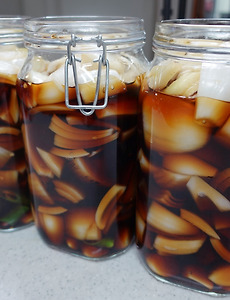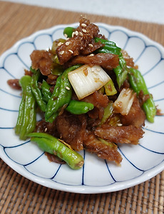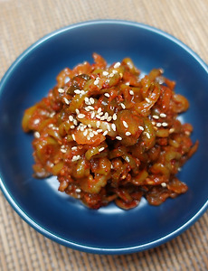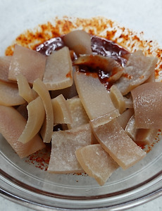 「 재료 」 돼지껍질 ..... 500g 된장 ..... 1숟갈 생강 ..... 1티스푼 대파 ..... 1대 통마늘 ..... 10개 월계수잎 ..... 5장 소주 ..... 1/3병 ※ 간은 기호에 맞게 가감해 주세요!! ① 넓은 웍에 물을 붓고 분량 (된장 1T, 생강 1t, 대파 1대, 통마늘 10개, 월계수잎 5장)의 재료를 넣어 주세요 ② 물이 끓어오르면, 돼지껍질과 소주 1/3병을 넣고 약 30분간 끓입니다. ③ 야들야들하게 삶아지면 찬물에 투하!! 깨끗하게 씻어준 다음,, ④ 껍질 안 쪽의 기름을 칼등으로 발라준 다음, 먹기 좋게 썰어주면,, 돼지껍질 손질 끝!! 양념장을 만들어 볼까요?? = 돼지껍질 250g 「 양념장 」 간장 1.5숟갈 맛술 1숟갈 고추장 1숟갈 올리고당 1/2숟갈 고..